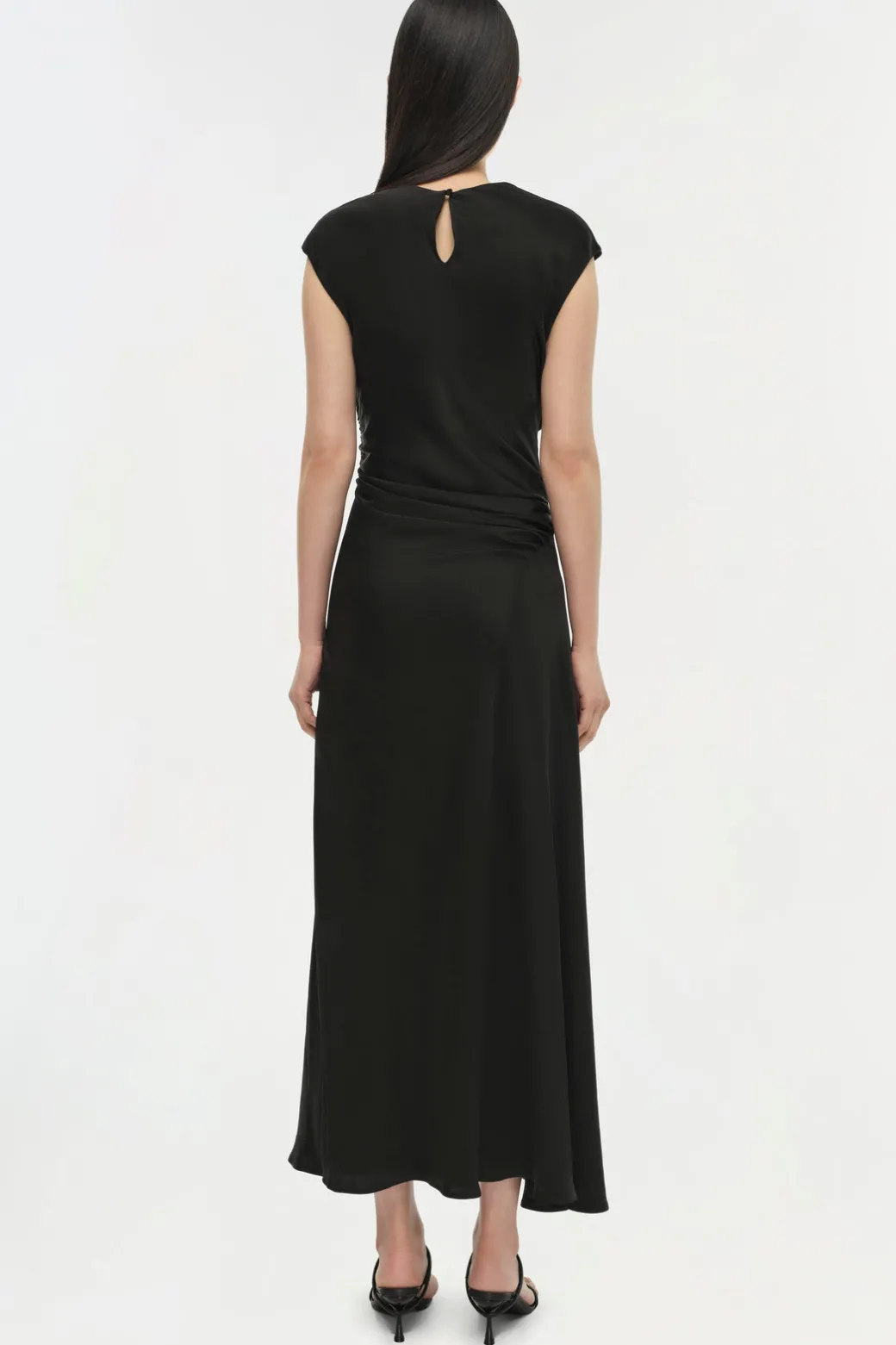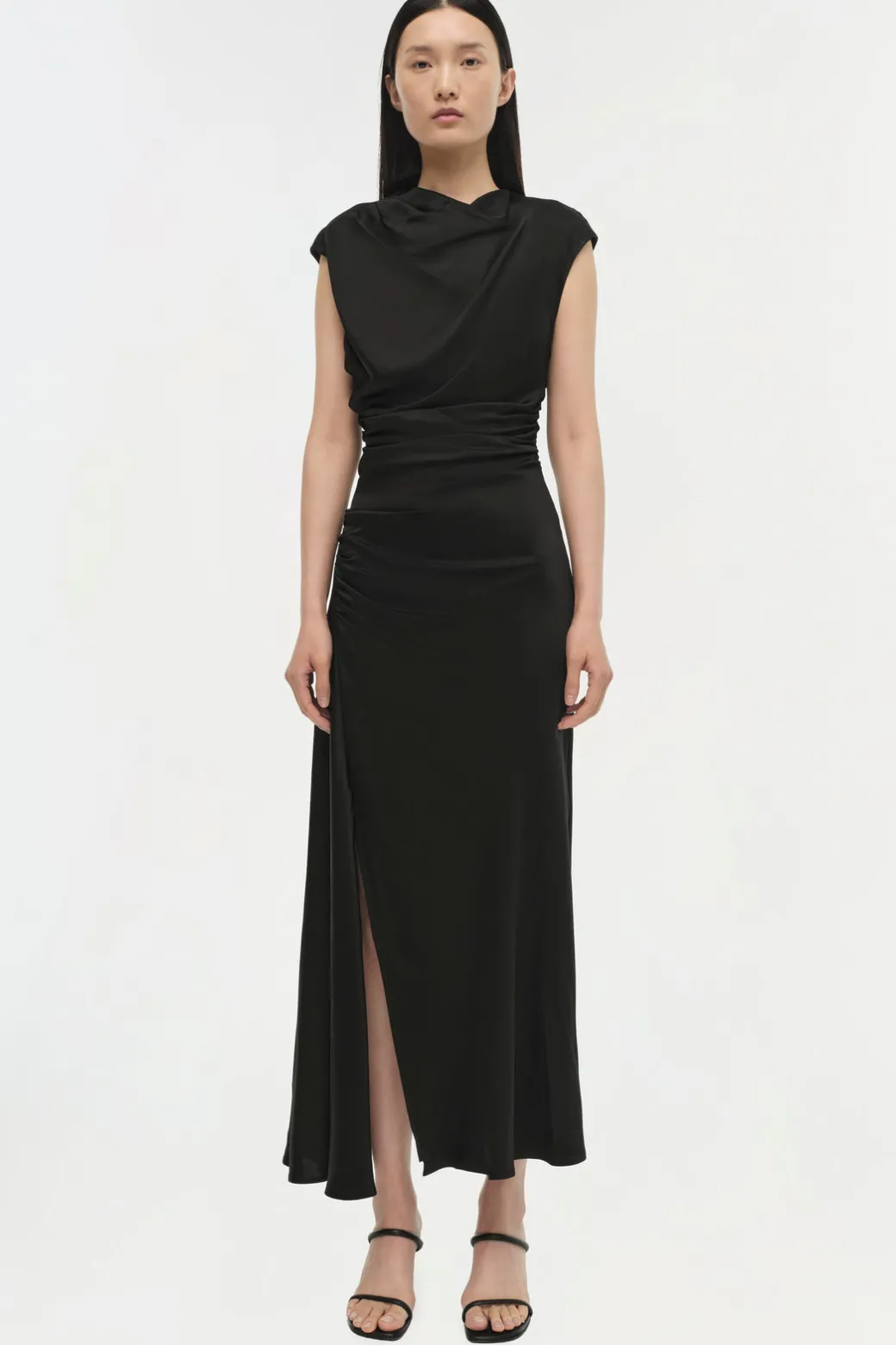 The Burke Dress in Black. This sleeveless draped midi features an elegant draped design with a high neckline and a sophisticated plaid pattern. Its sleeveless cut and fluid silhouette create a refined, timeless look.