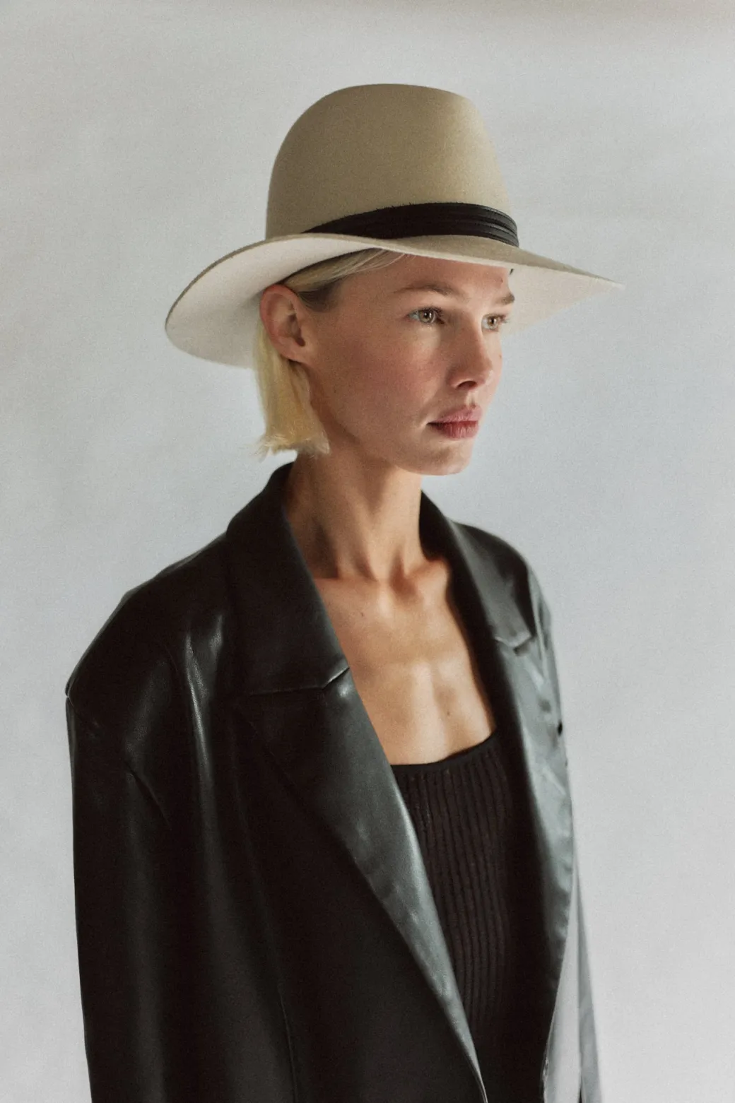 Soft-structured wool fedora | 3/4″ Regenerative Leather Band double stacked | Silver buckle hardware closure