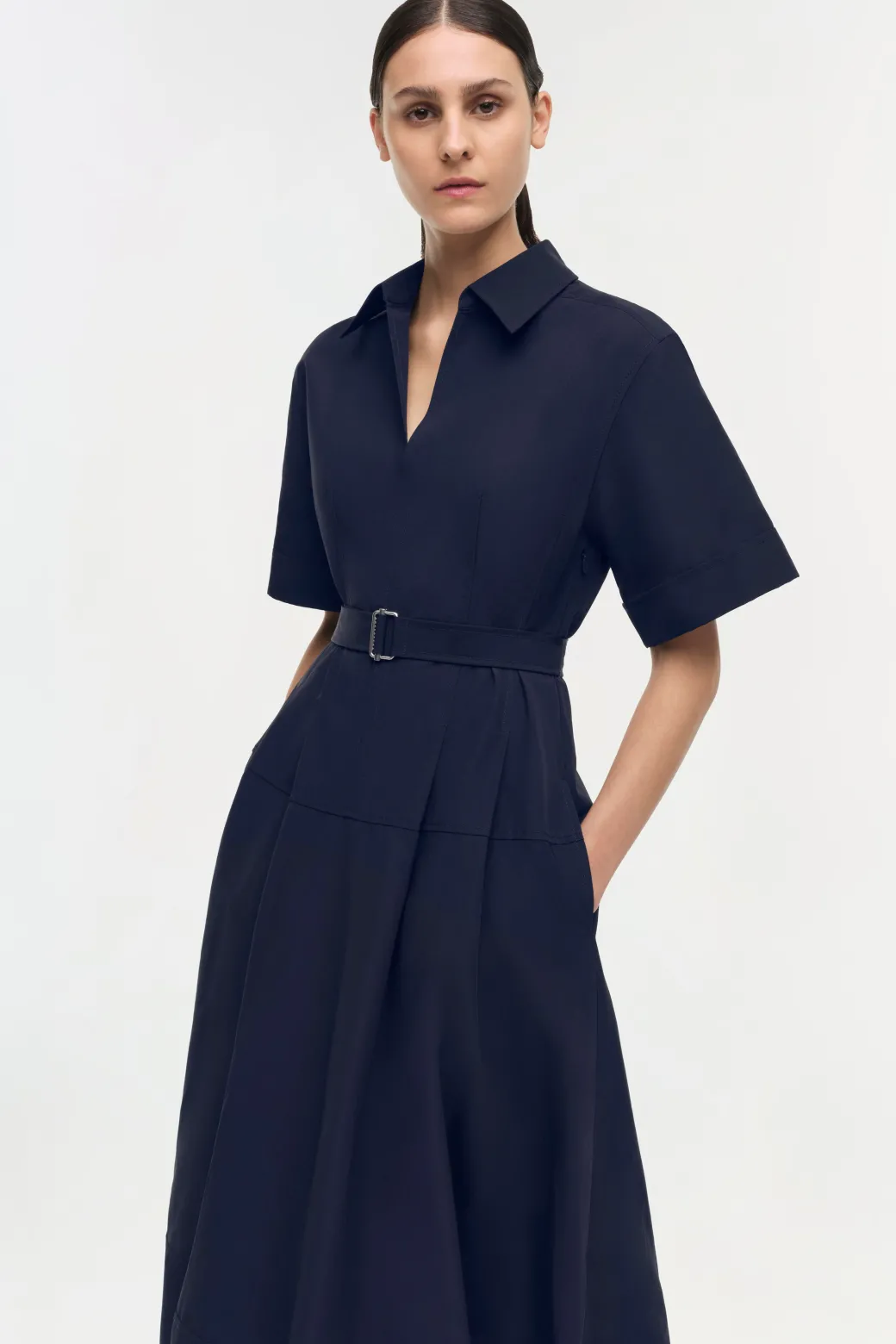 The Deanna Dress in Midnight. Embrace timeless elegance with this navy belted midi. Designed with short sleeves and a crisp collar, it cinches at the waist with a sleek belt, flowing into a flattering A-line silhouette. Perfect for a polished and sophisticated look.
