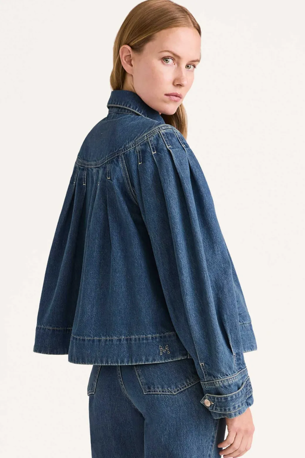 An easy-to-wear denim jacket with an A-line silhouette, the EASTON BLUE is Merlette’s interpretation of a timeless classic. With a point collar, the jacket features contrast stitched pleats at the yoke, custom hardware and an embroidered Merlette ‘M’ on the back hem. The pockets are also decorated with signature Kantha embroidery. The EASTON BLUE is crafted in organic GOTS certified cotton denim and treated with a responsible ozone wash to create unique variations in tone. Pair it with the BEACON BLUE pants for a full denim ensemble.