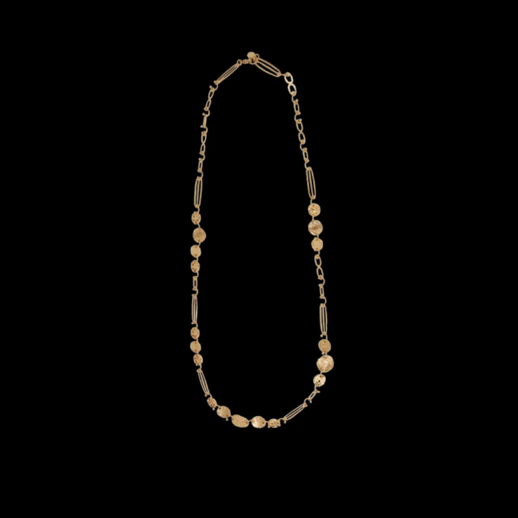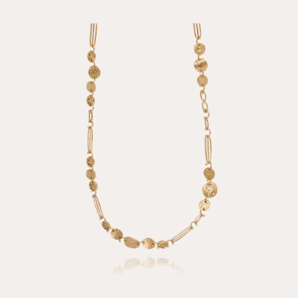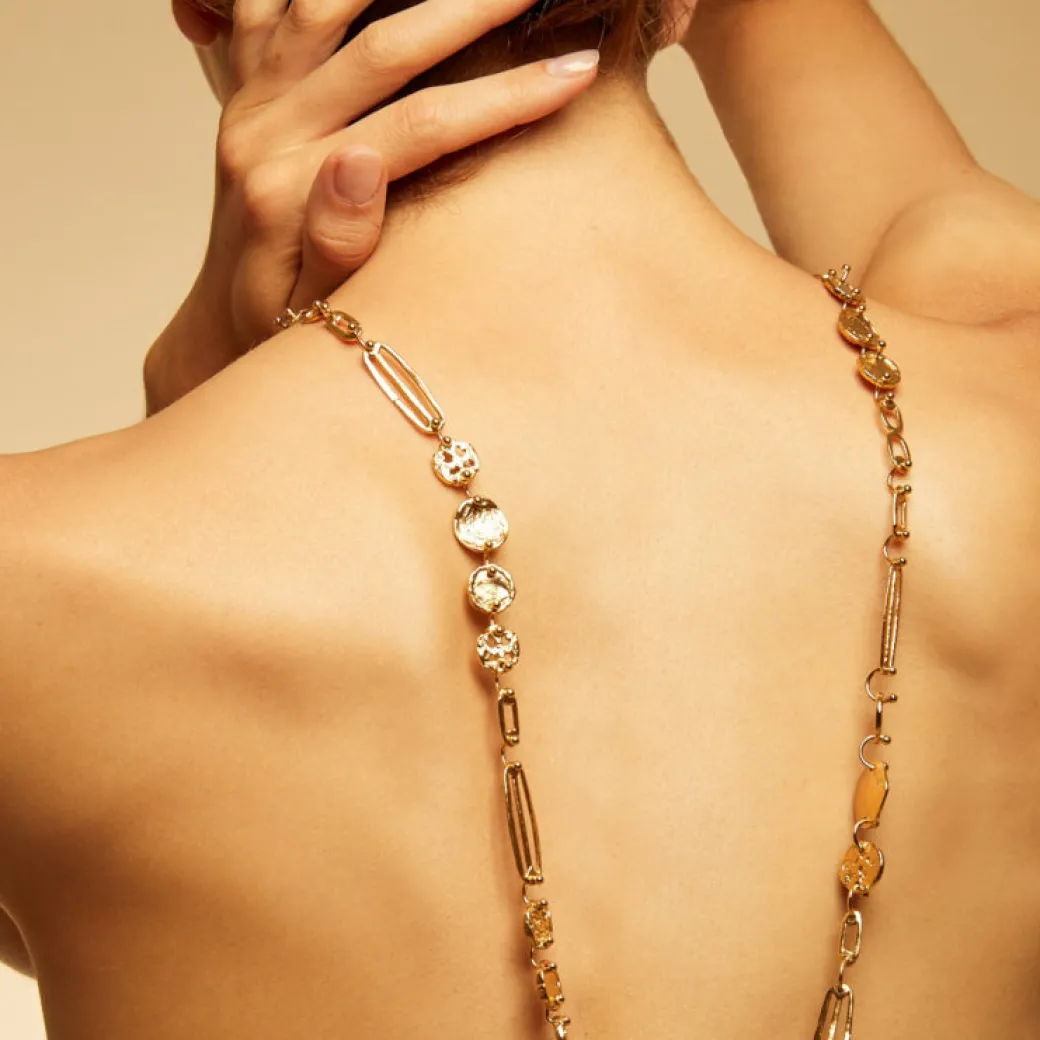 Eclipse gold plated long necklace, inspired by the surface of the moon, composed of fine links and irregular rounds delicately hammered by a craftsman. A collection of singular shapes where irregularity creates charm. Adjustable size.