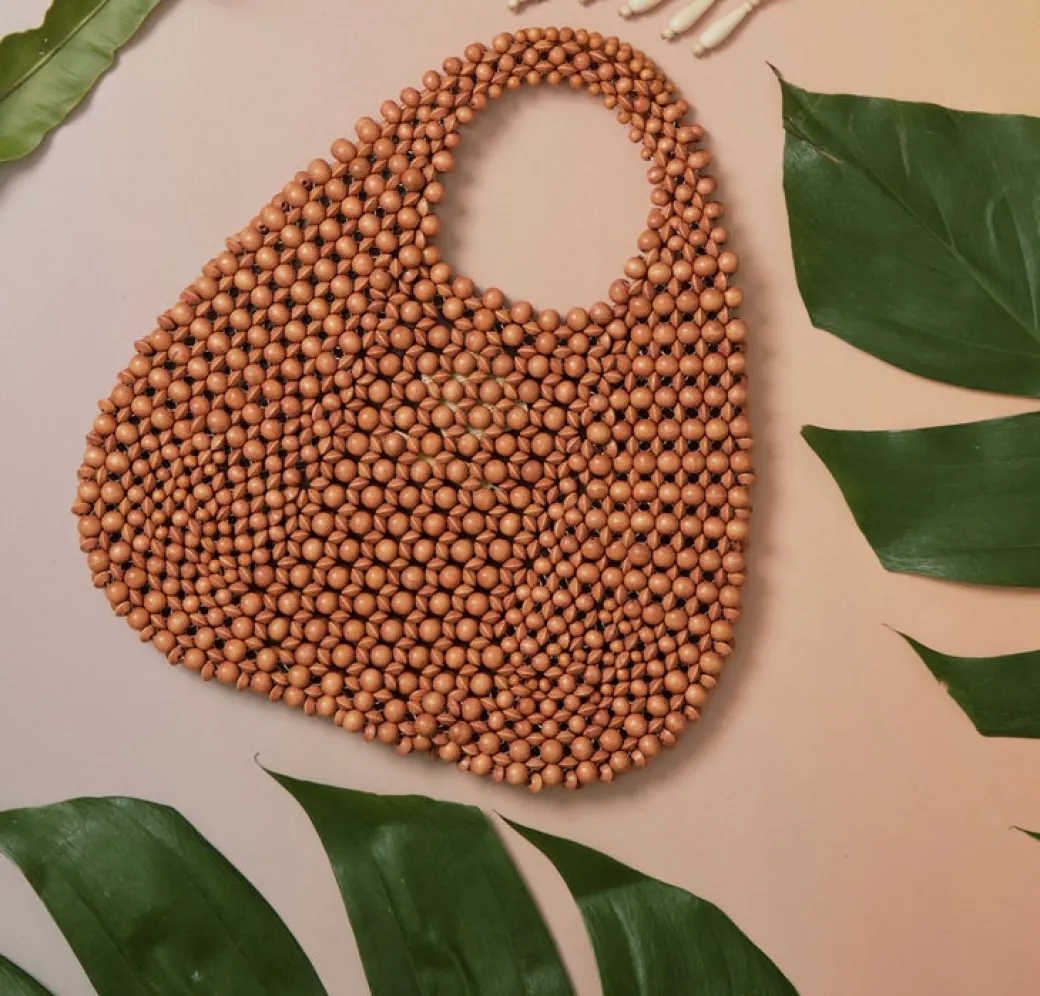 This handbag is an exquisite statement piece. Hand-crafted from natural wood beads, it adds a luxurious, timeless touch to any ensemble. Elegant and sophisticated, the tear-drop shape is perfect for toting around your essential items while making a fashionable statement.