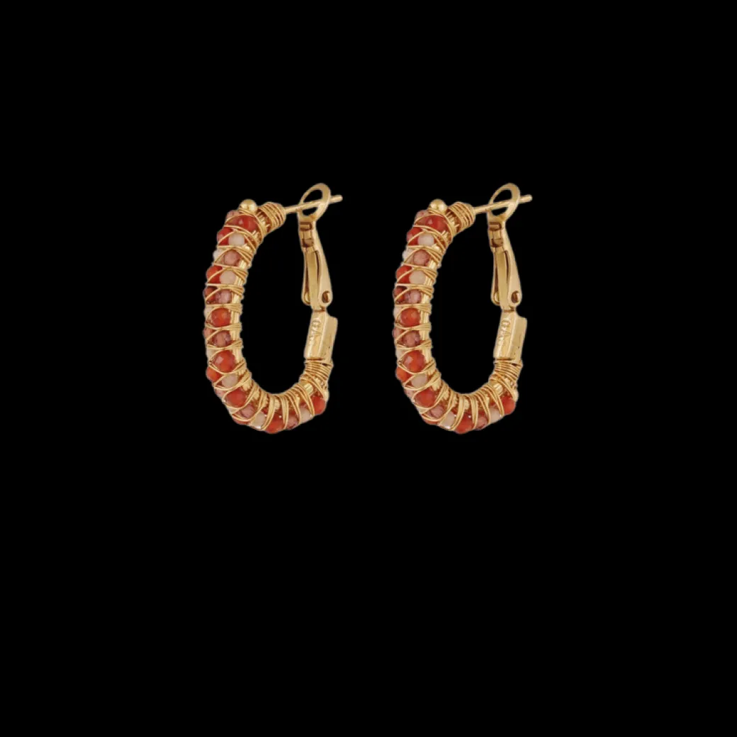 Gold plated creole earrings with Carnelian gemstones pearls and metal wire rolled.