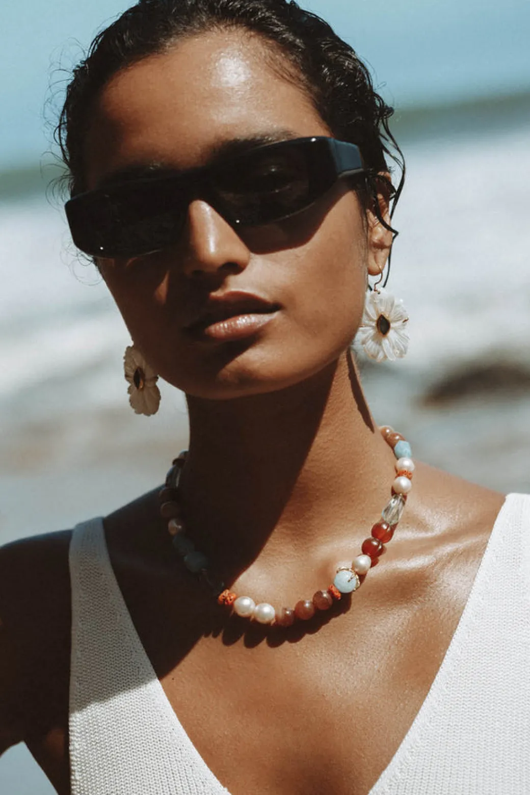 Necklace of semi-precious gemstones, freshwater pearls, and detailed gold bird claw clutching an aquamarine stone. A beachy statement piece.