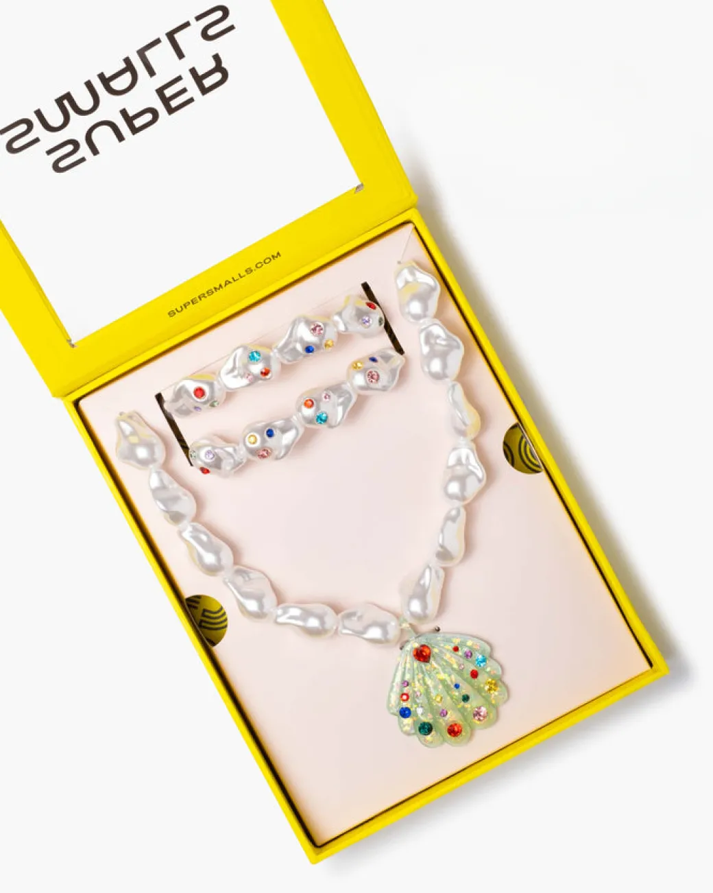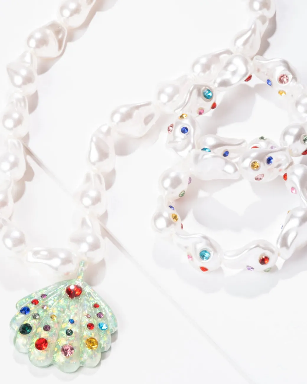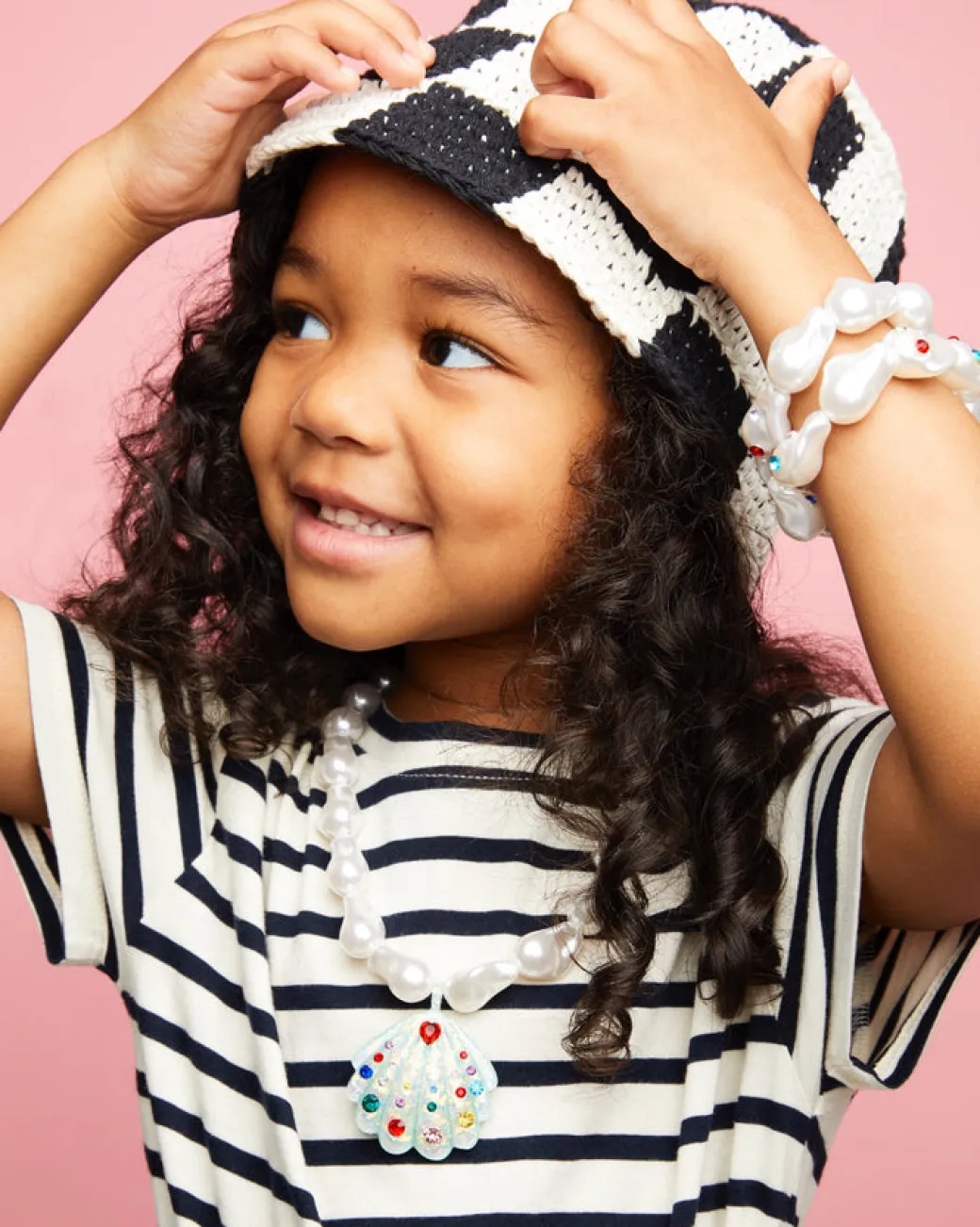 Everyone dreams of becoming a mermaid—they dive and dance through the ocean! Now you can channel their sparkly vibes in and out of the water all day. This magical, summery set was dreamed up and designed by Luna, our Kid-in-Chief. Featuring “freshwater pearls” and a gem-covered sea shell, these stretchy jewels are made for easy on-and-off and for getting wet (but try to keep that goopy sunscreen away from your precious gems)!