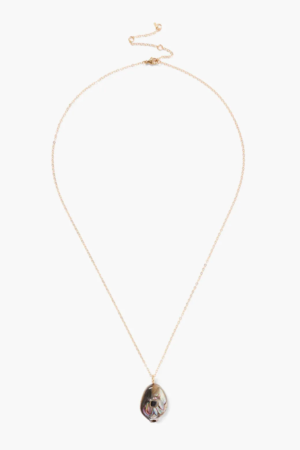 14k gold necklace featuring an abalone pendant with black sliced diamond inlay.