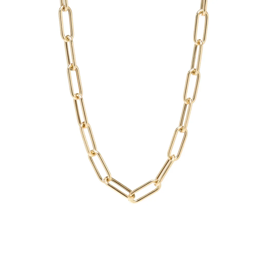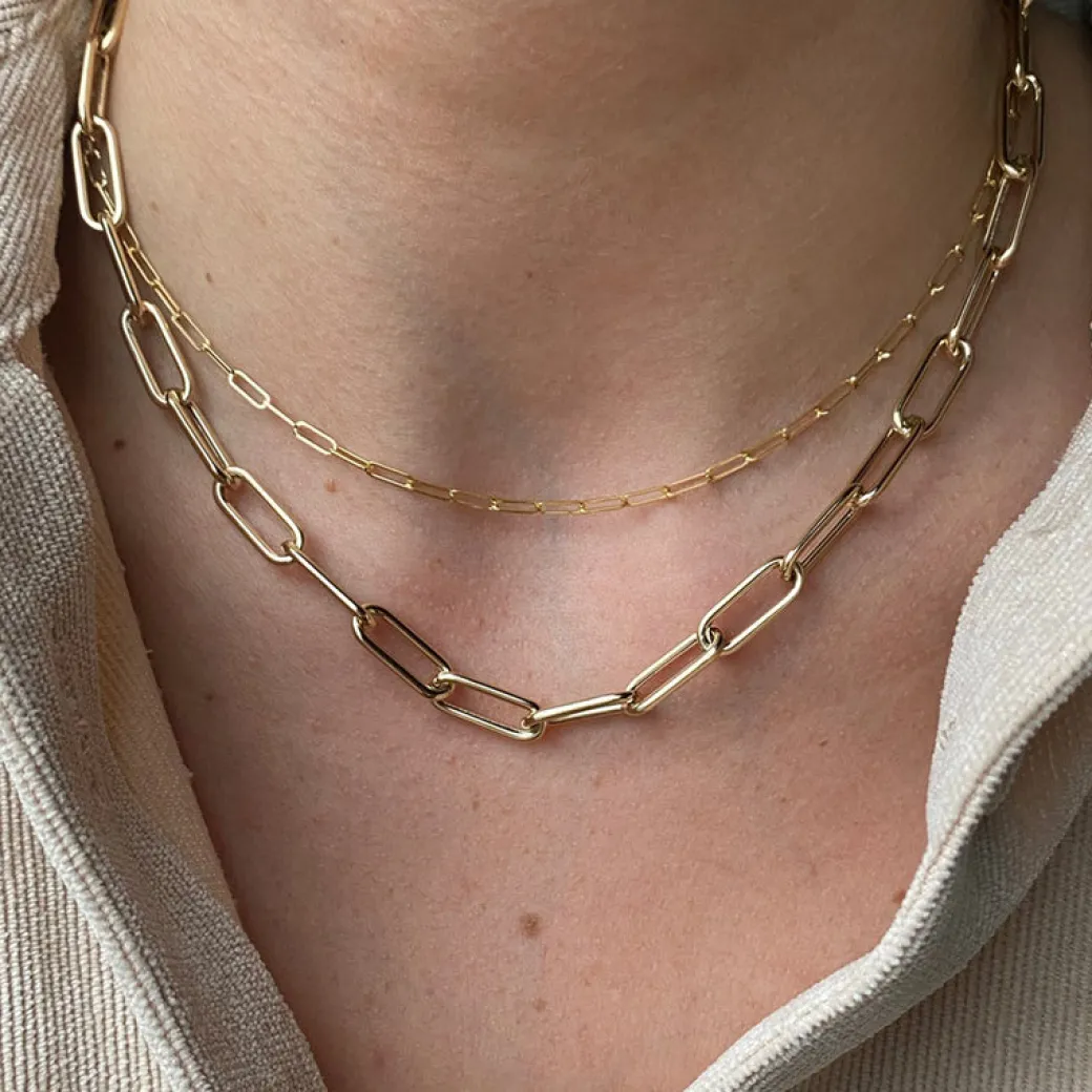 14k gold large hollow paperclip link chain necklace. Clasp can be hooked onto another link to create a lariat necklace to allow a clip-on charm of your choice to be added.
