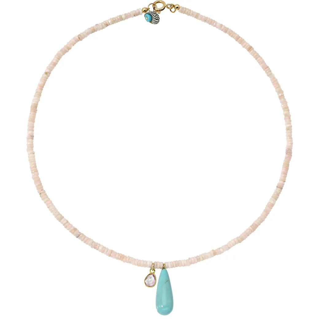 Graduating Pink Opal beads, a Chrysoprase drop and an Emerald, 14K Gold Necklace