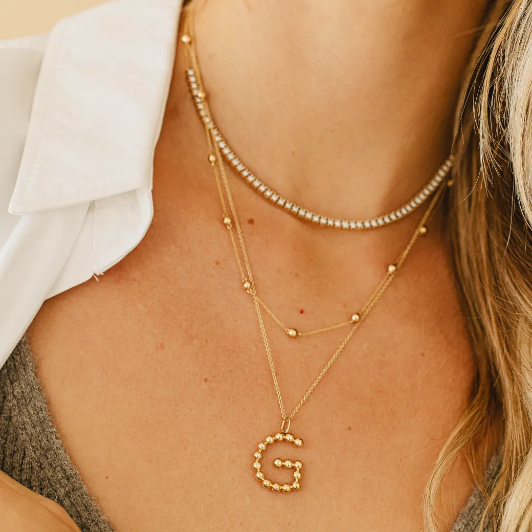 This necklace is all about being bold + rocking gold! The Poppy Rae Pebble Initial Necklace is the ultimate way to proudly flaunt the initial of your choice. The removable initial is our largest initial charm, a bold alternative to our smaller, dainty initial charms. As a homage to an important person in your life, or as a celebration of self, the Poppy Rae Large Pebble Initial Necklace lets you select your favorite letter for a custom gold necklace with initial charm. Each of these initial gold charms is crafted from our signature gold pebbles for a textured look that truly stands out. The 14k solid gold pebbles match the size used in our best-selling Poppy Rae Pebble Hoops and Poppy Rae Large Pebble Ring. We consider this solid gold necklace the ideal way to honor yourself or a person close to your heart — the dimension of the gold is eye-catching and the pebbles are prominent and FUN. This will be your go-to “anchor” necklace that effortlessly grounds your growing neck stack!