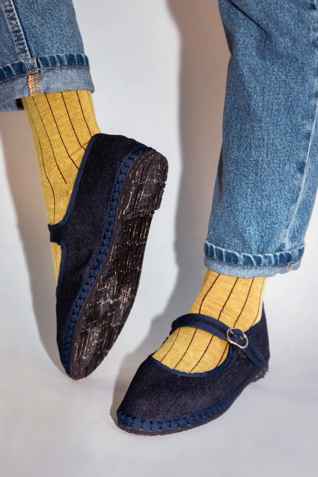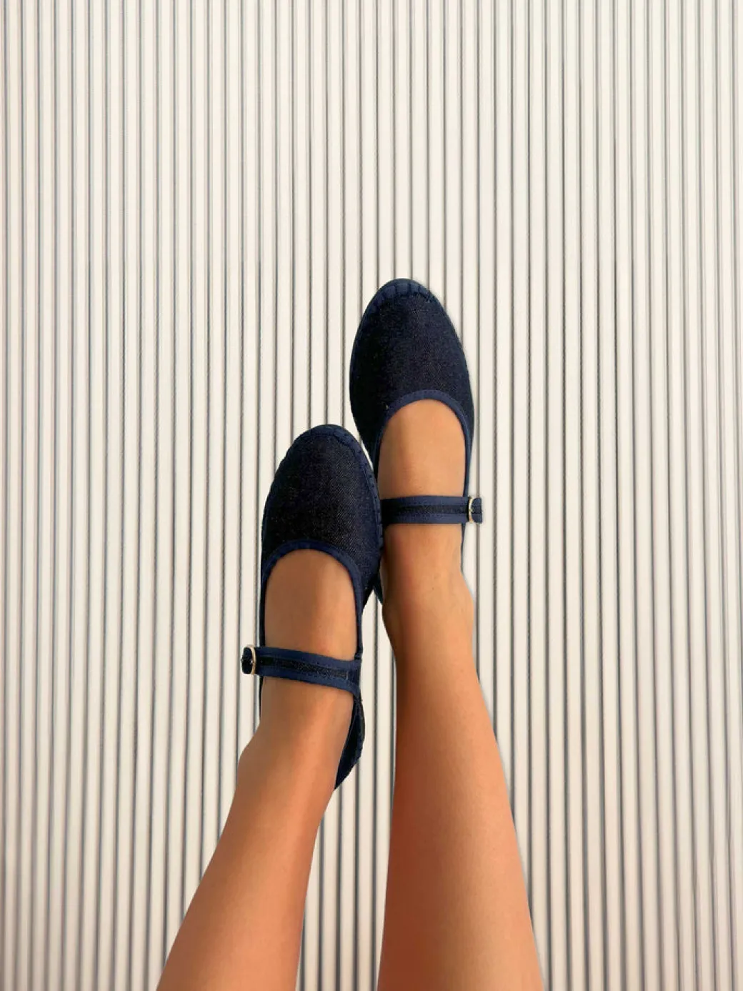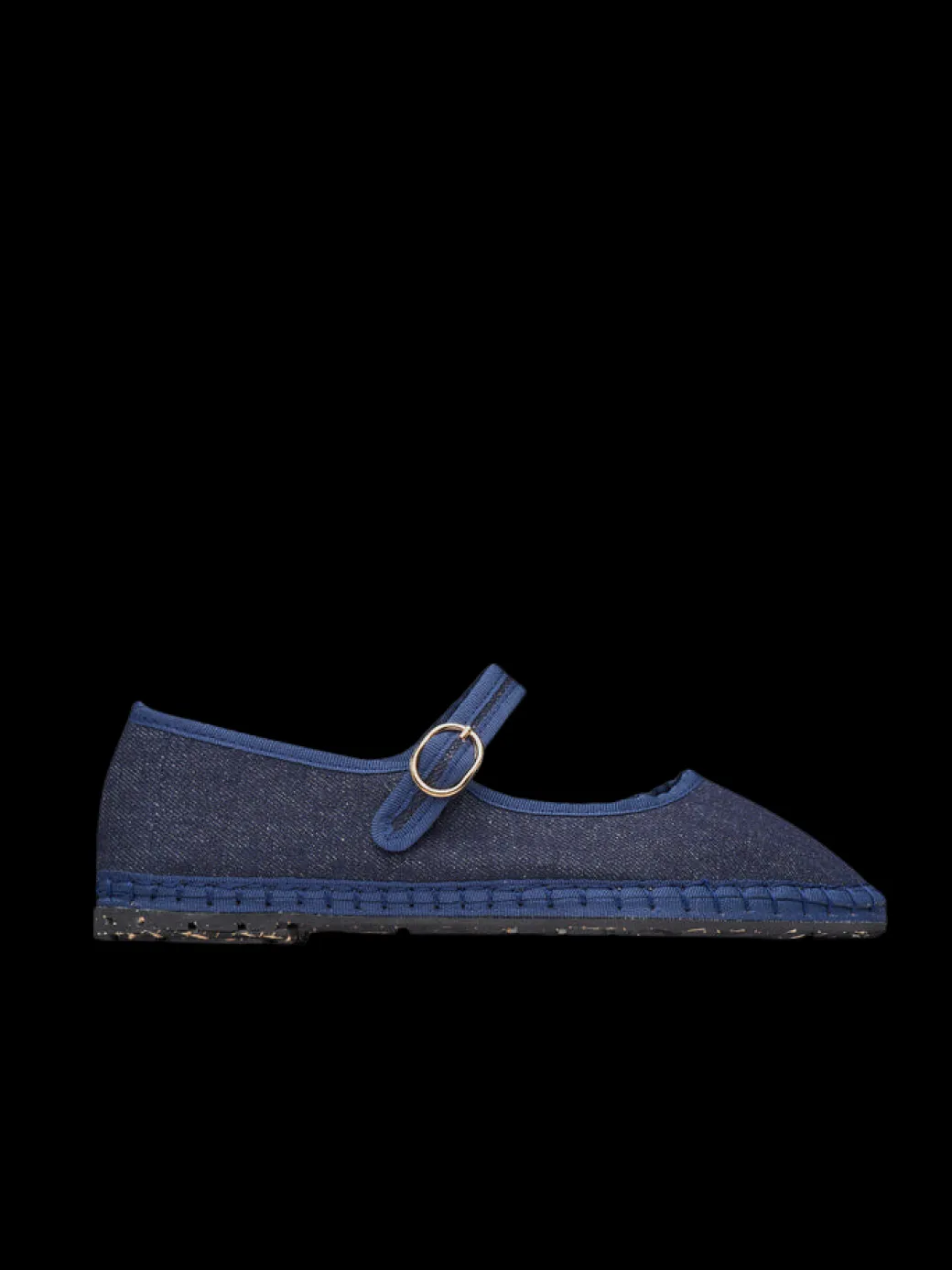 Denim mary jane in dark blue with dark blue piping and buckle closure.