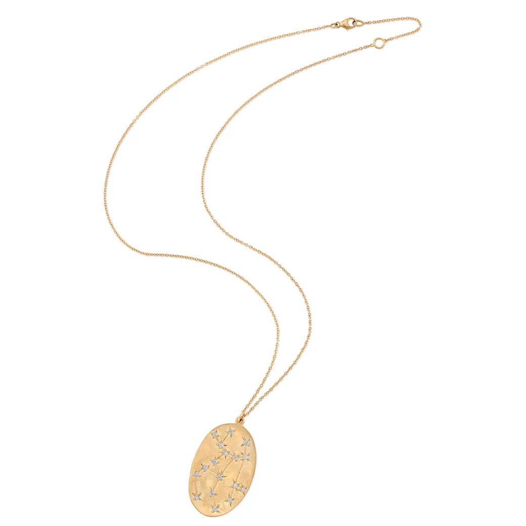 14k brushed gold Astrology necklace with 17 VS1 full cut diamonds in a constellation design with 14k gold chain.