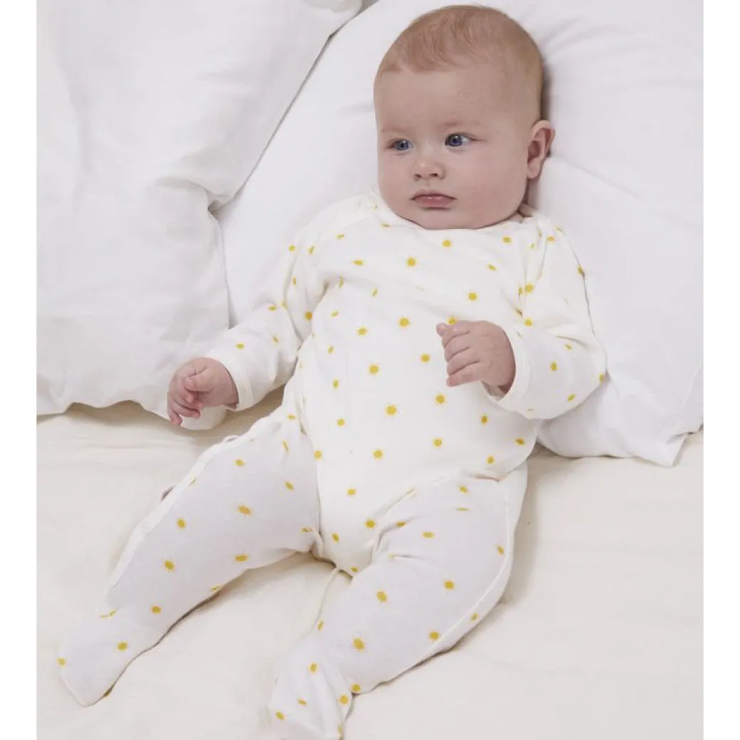 Crossover side snap long sleeve footie with all-over yellow sunshine print.