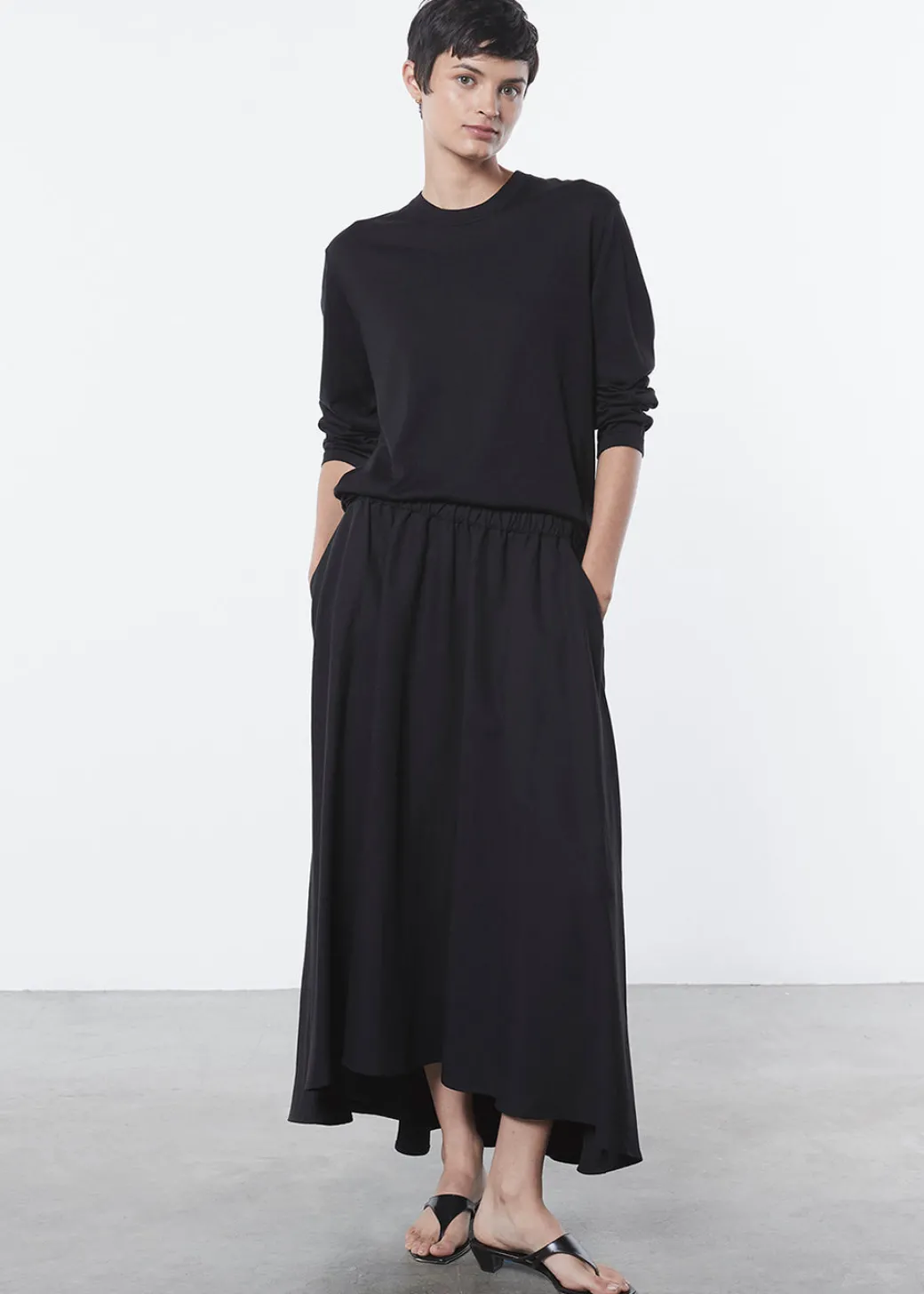 Our Silk Knit Easy L/S Tee is knit from a luxurious blend of silk and cotton. A softly draping classic crewneck with dropped shoulders and an easy silhouette.