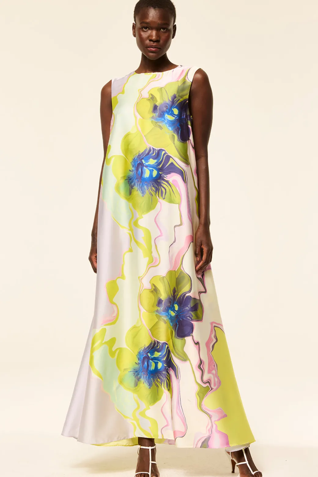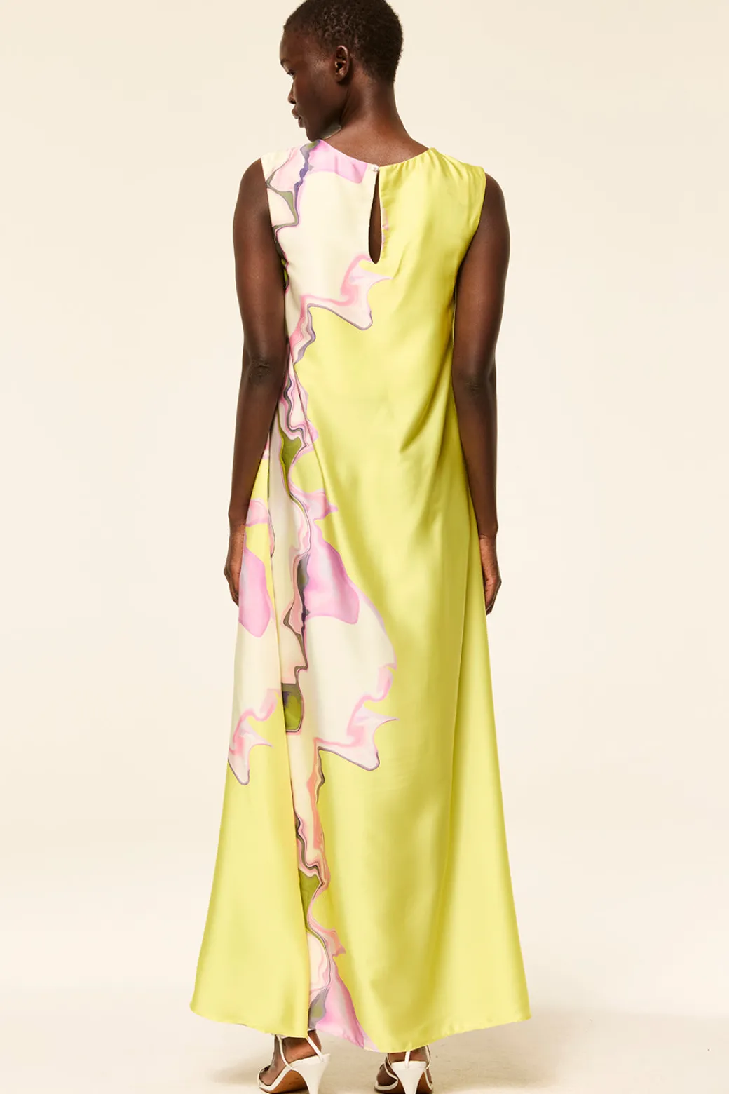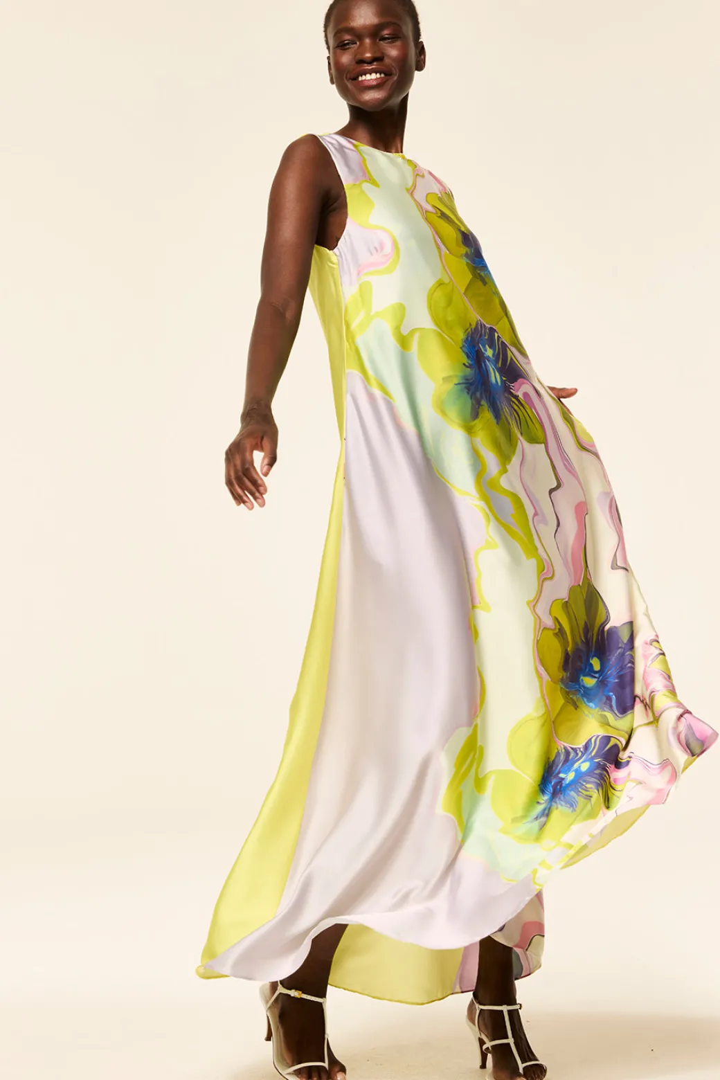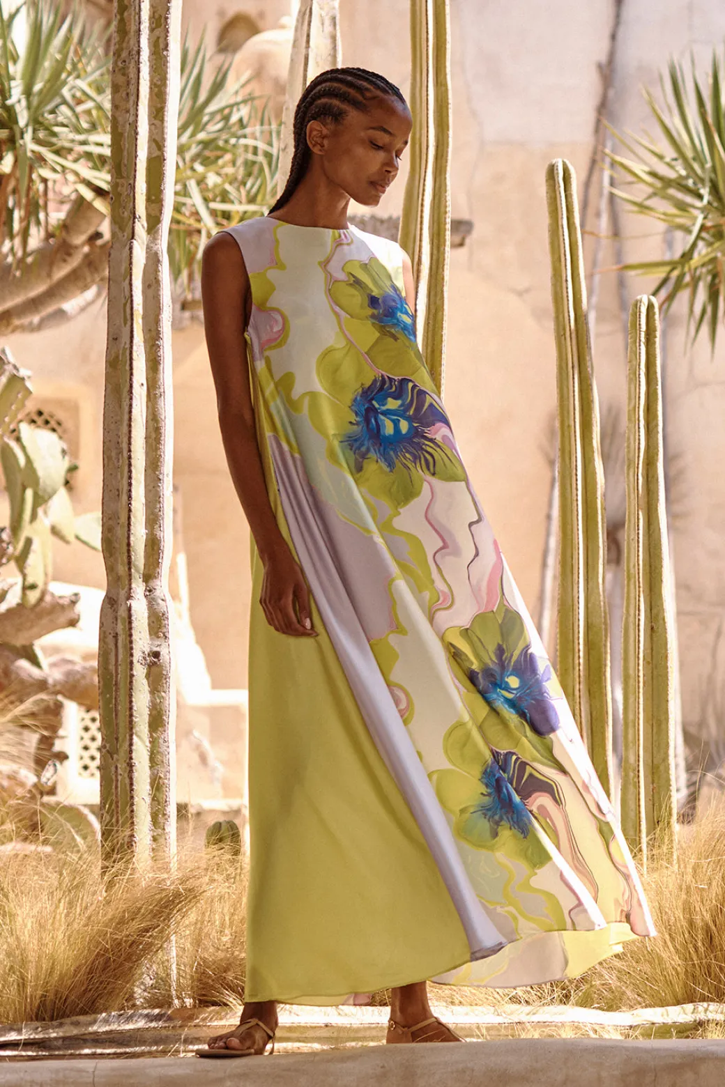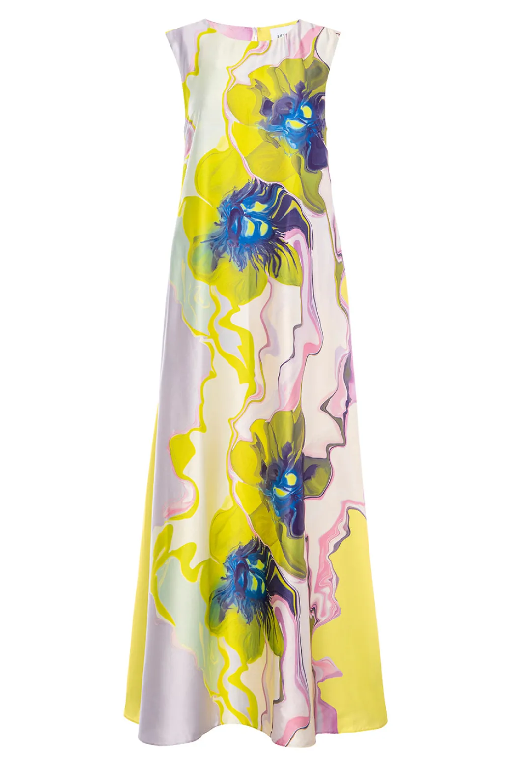 Our new Sylvie dress is all things spring in a vibrant Marble Flora satin with a solid chartreuse back. This modern, flowing, sleeveless maxi dress features a high neckline with keyhole button-back closure. Pair with a simple heel or flat for a look that will carry you through the spring season and beyond.