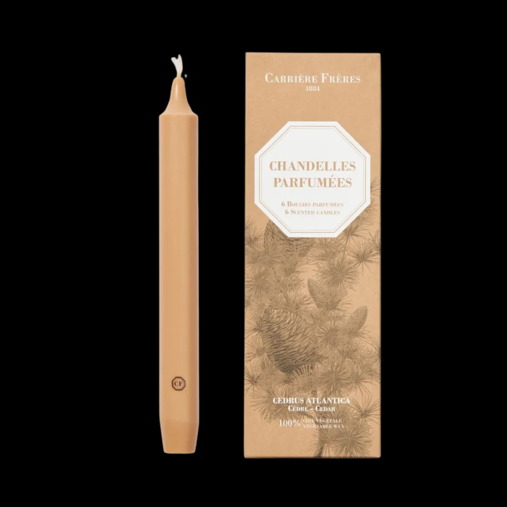 Their botanical perfume prevails when opening the box; once lit up, the taper candles only diffuse a golden halo.