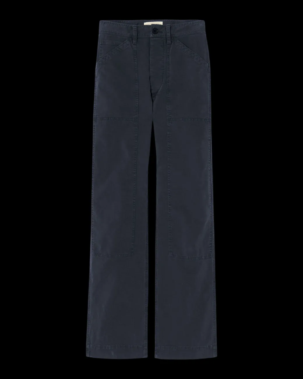 Mid-rise straight leg pant in Italian brushed cotton twill. Welder patch front detail. Front and back patch pockets. Hammer loop. Seam detail at back. Adjustable cinched back buckle detail. Belt loops.