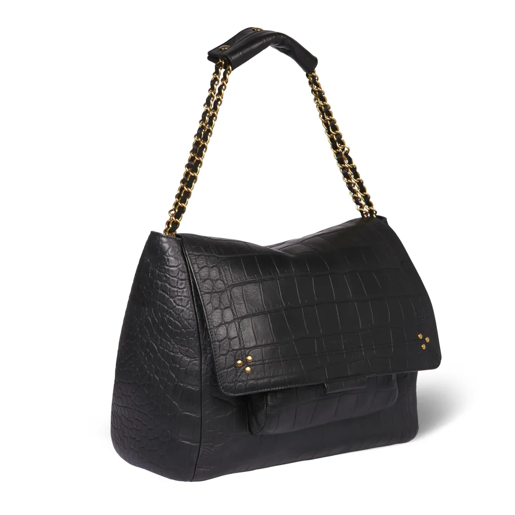 Adjustable chain and leather shoulder strap, measuring 105 cm. Wide leg shoulder belt. Flap with snap button closure. One exterior zipped pocket. One interior pocket. One flashlight and key hook inside.