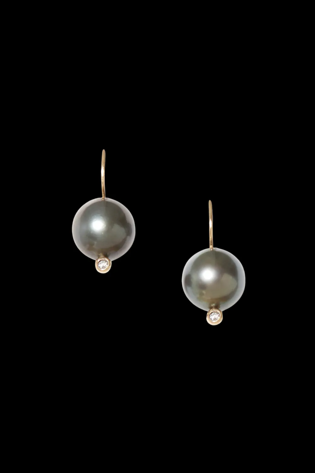 These elegant drop earrings feature black Tahitian pearls accentuated by subtle white diamonds on solid 14k gold French hooks.