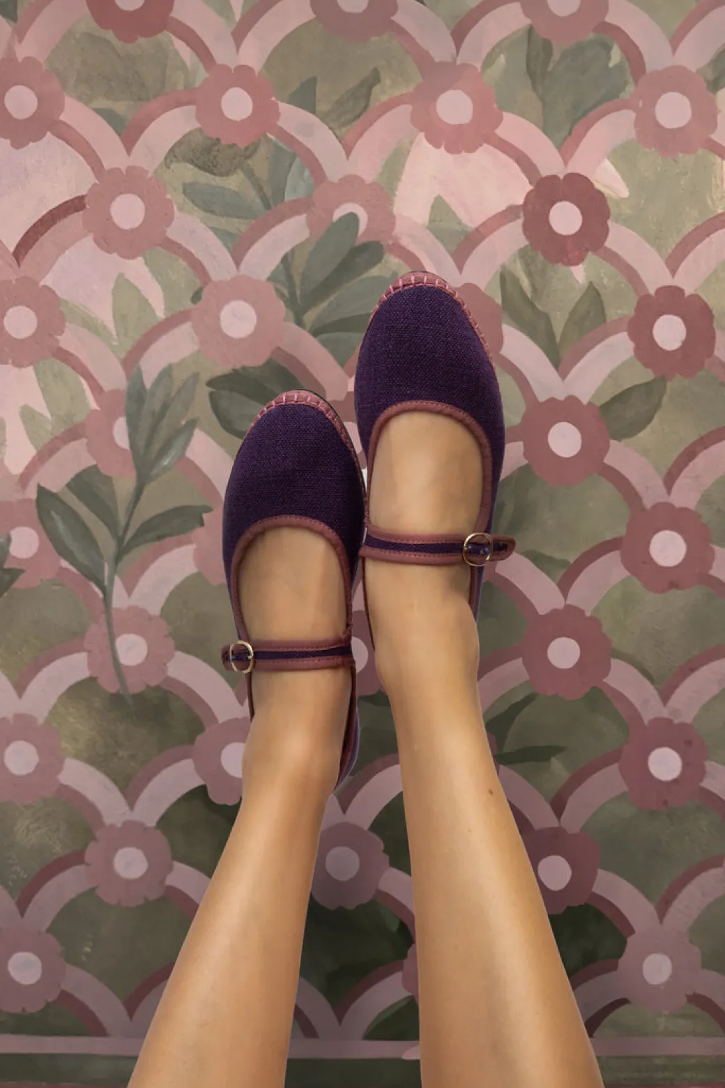 Purple linen mary jane with pale pink piping and buckle closure.