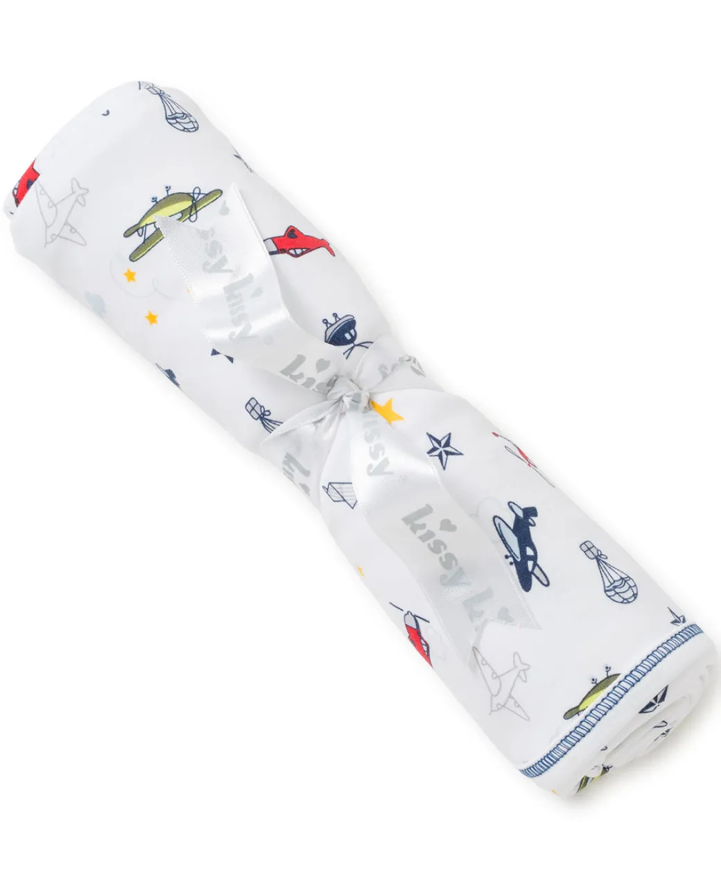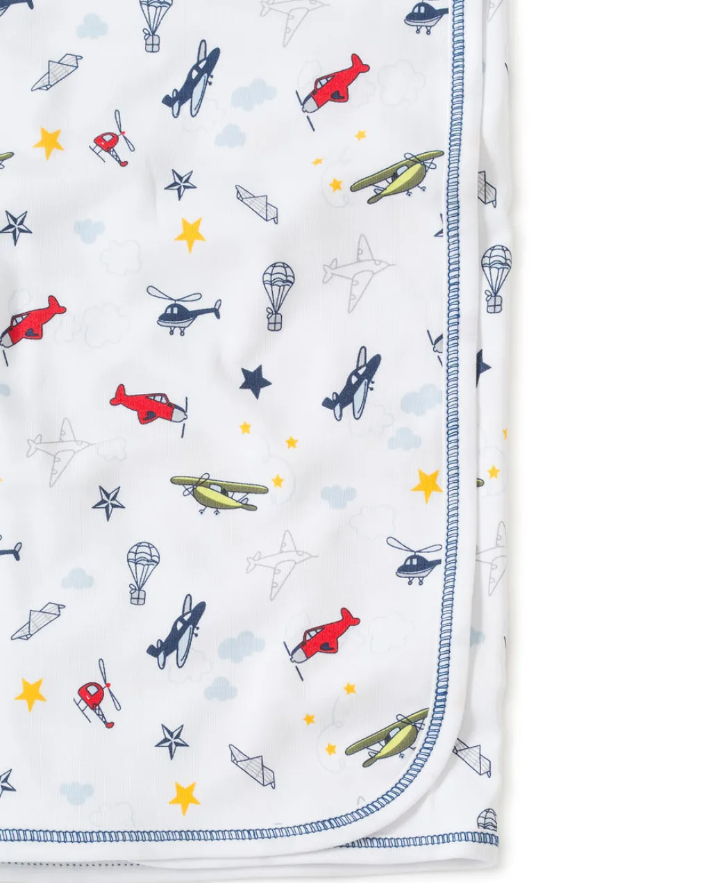 - Snuggle up with this cozy Pima cotton blanket covered in a fun and playful aviation print.