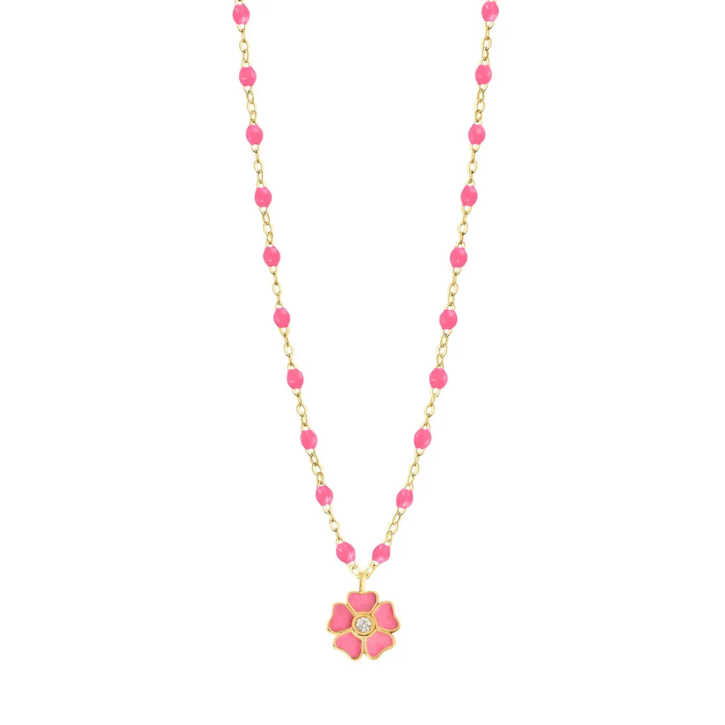 The Classic Gigi Flower Necklace by gigi CLOZEAU features 18 carat Yellow Gold, Pink resin pearls with a subtle diamond in the center of the flower.