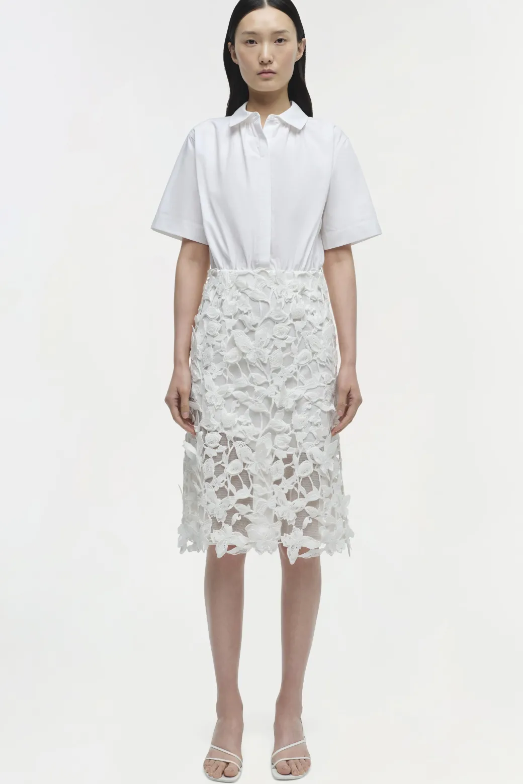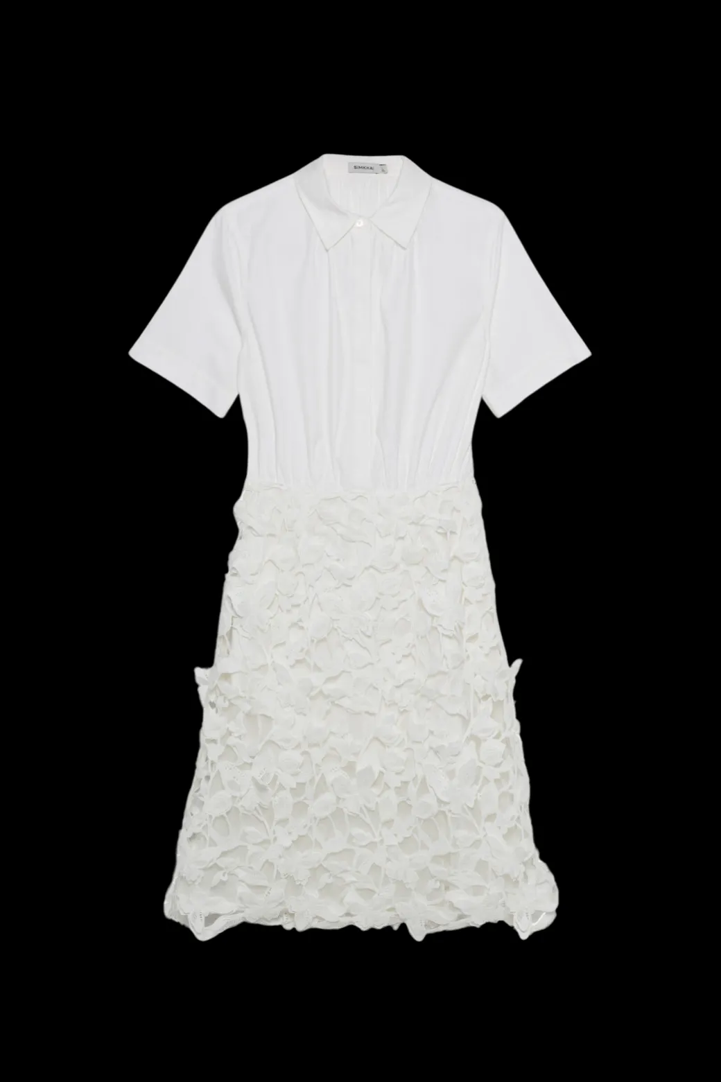 The Colette Applique Midi Dress in White. Featuring intricate 3D floral guipure detailing, this short-sleeve combo dress is expertly crafted to bring dimension and artistry to a contemporary silhouette.