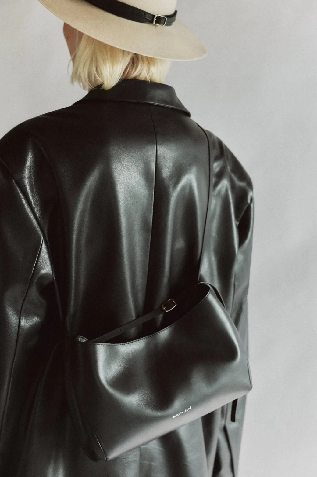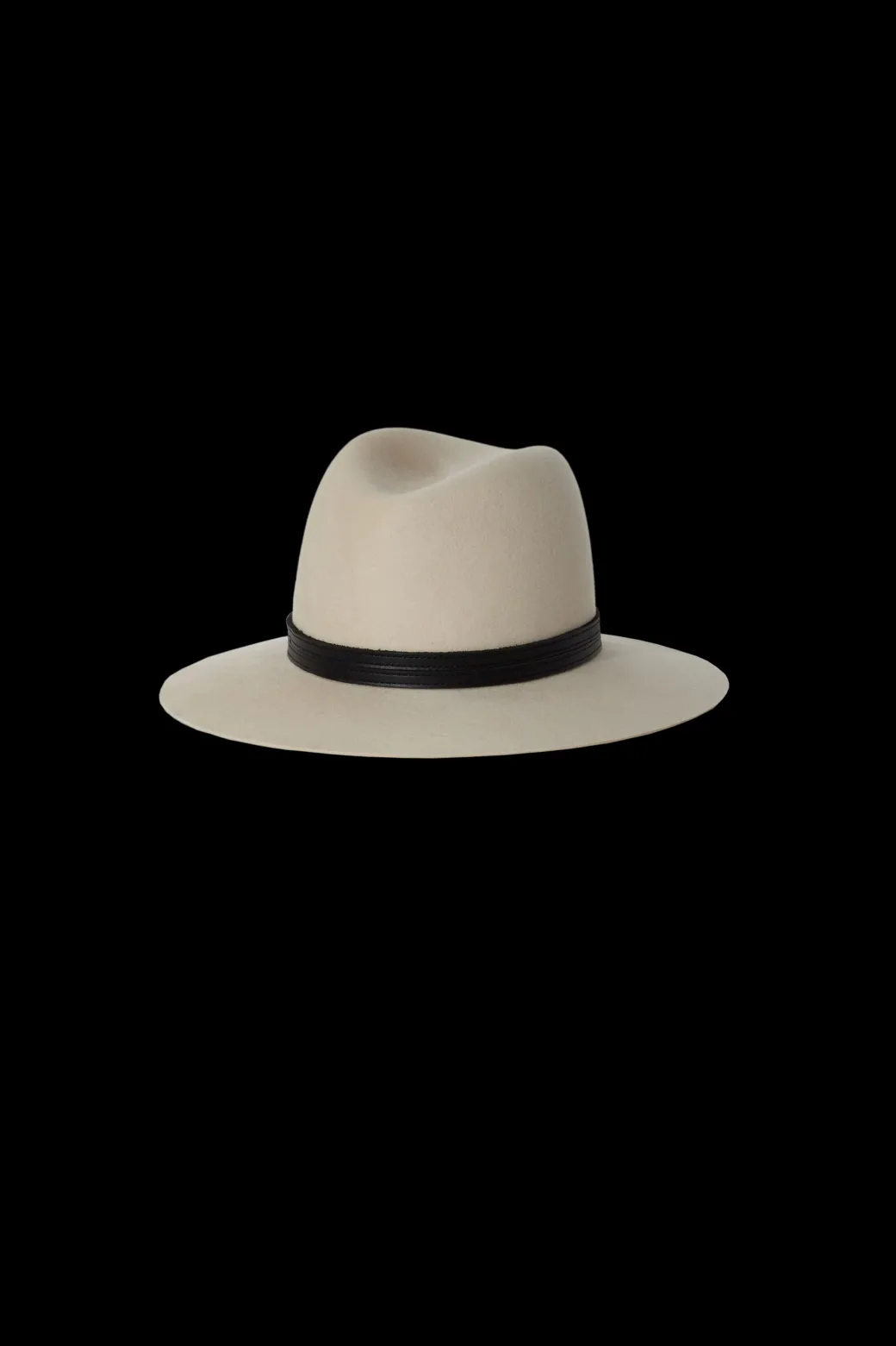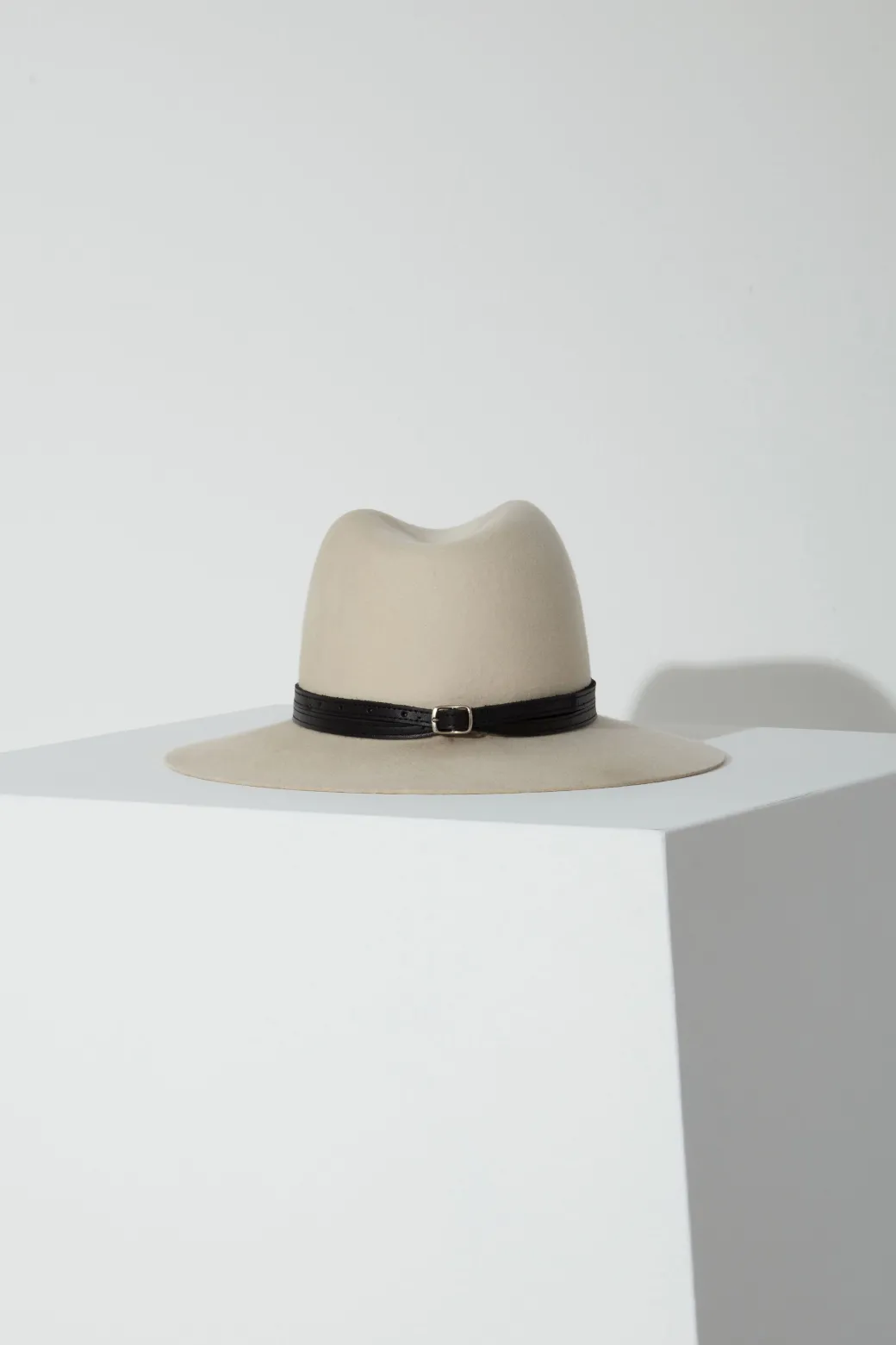 Soft-structured wool fedora | 3/4″ Regenerative Leather Band double stacked | Silver buckle hardware closure