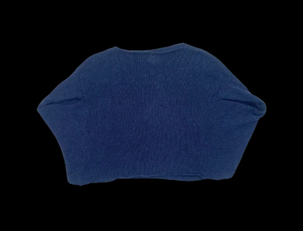 Stay cozy and stylish in this quirky navy cotton sweater. Hand-knit with a slightly cropped design and slit sleeves, it’s the perfect layer for any occasion.
