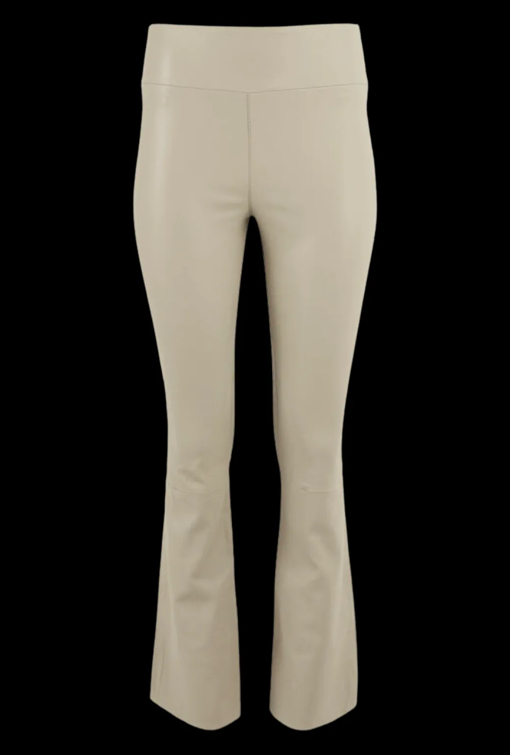 High-waisted alabaster leather crop flare leggings. Pull on stretch leather pants with elastic waistband and raw hem.