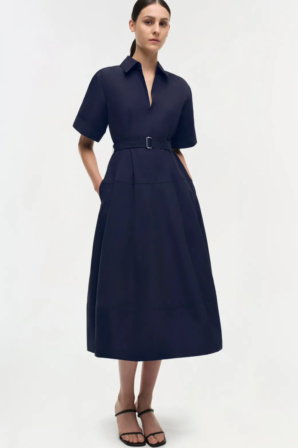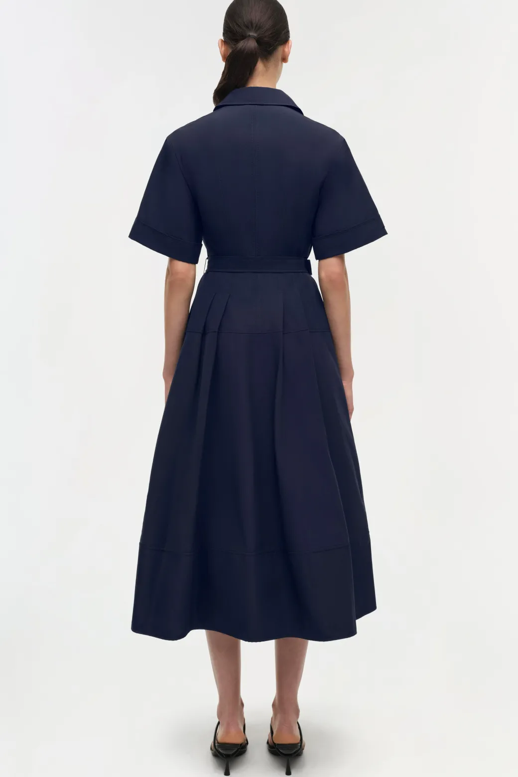 The Deanna Dress in Midnight. Embrace timeless elegance with this navy belted midi. Designed with short sleeves and a crisp collar, it cinches at the waist with a sleek belt, flowing into a flattering A-line silhouette. Perfect for a polished and sophisticated look.