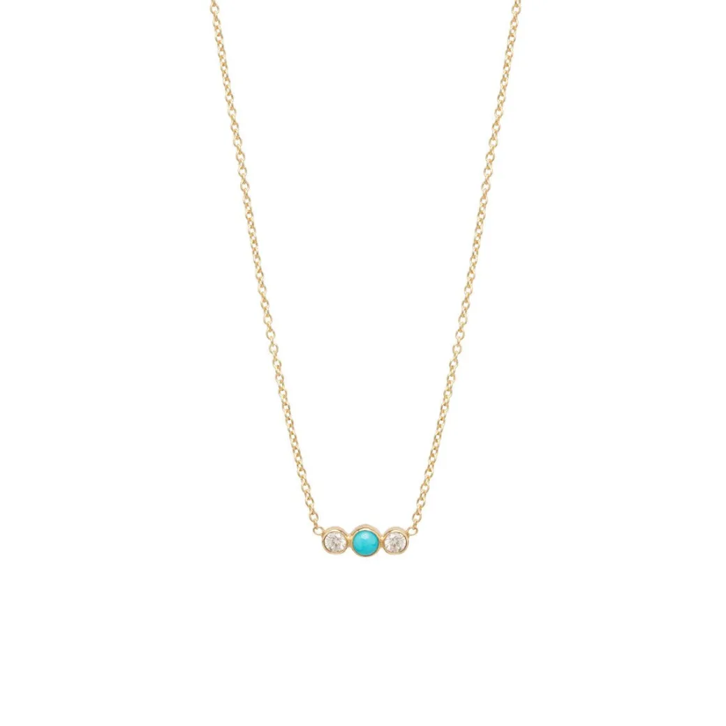 14k gold necklace with a bezel set round turquoise stone with white diamonds on either side