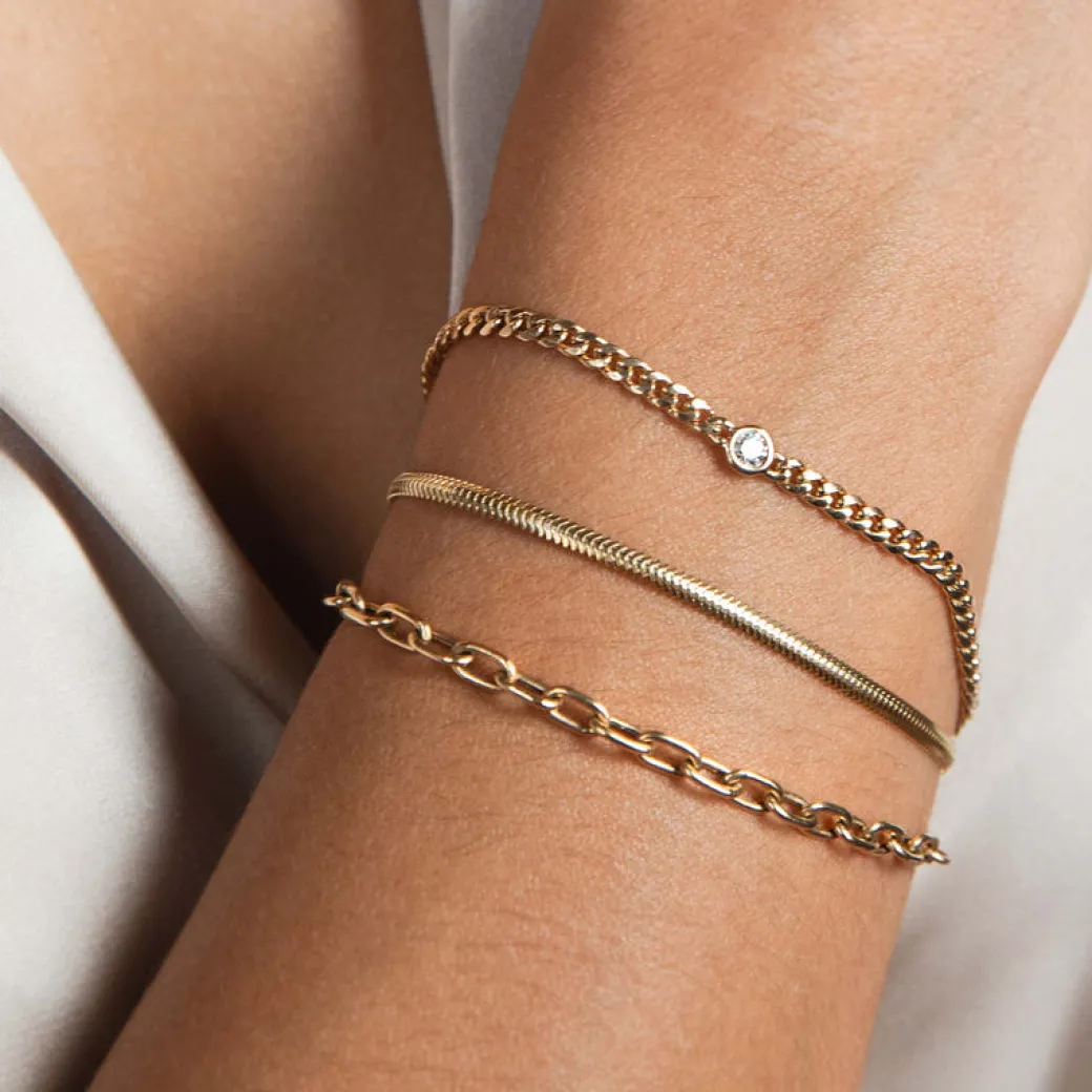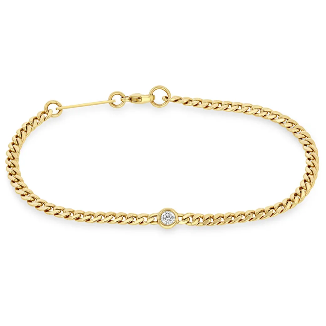 14k small hollow curb chain bracelet with a single floating white diamond set in the chain