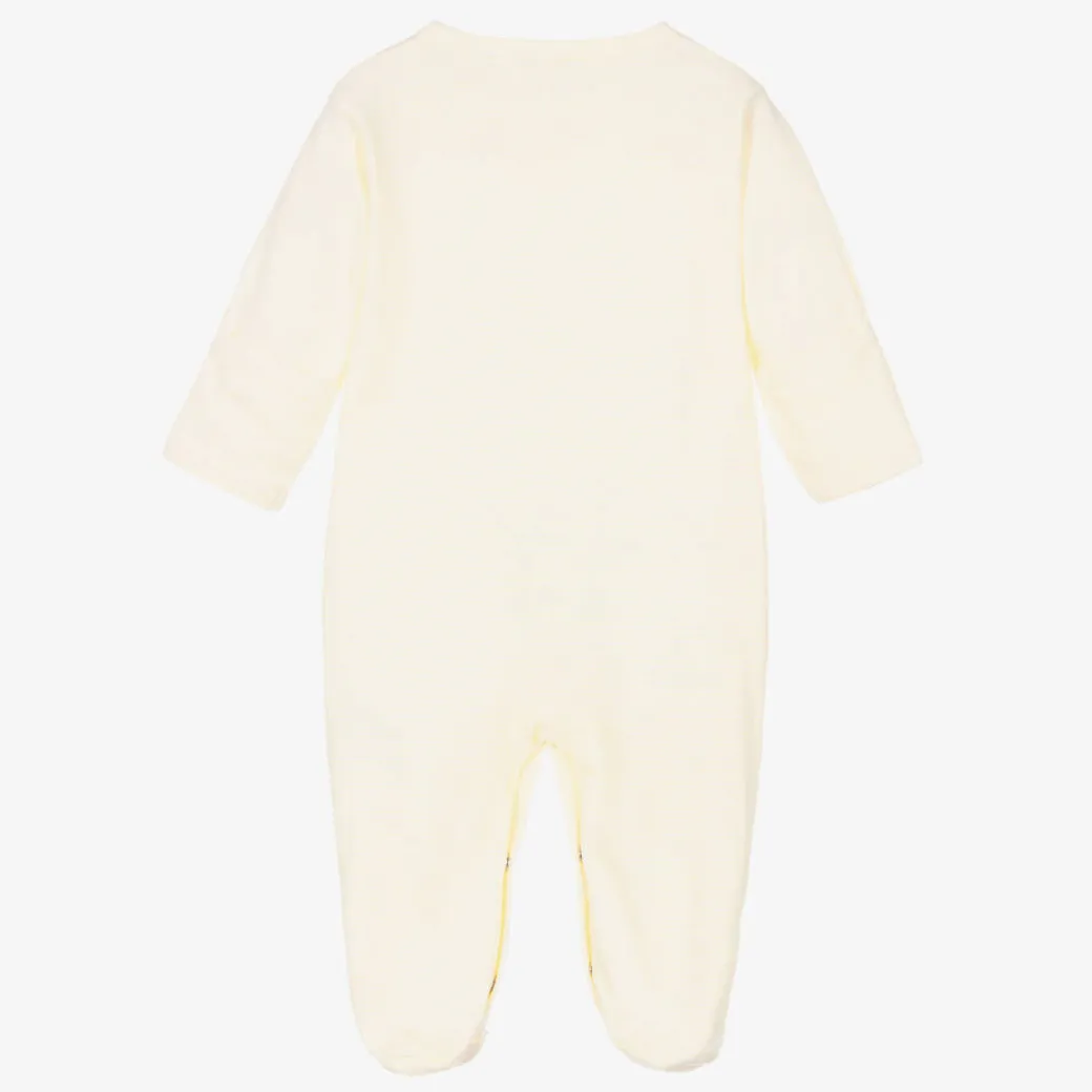 Yellow striped babygrow for boys and girls by Kissy Kissy. Made in beautifully soft Pima cotton jersey, it has sweet yellow ducks embroidered on the front for a cute look. To help with dressing and changing, there are popper fastenings on the front and between the legs. On smaller sizes, there are protective, fold-over scratch mitts on the cuffs.