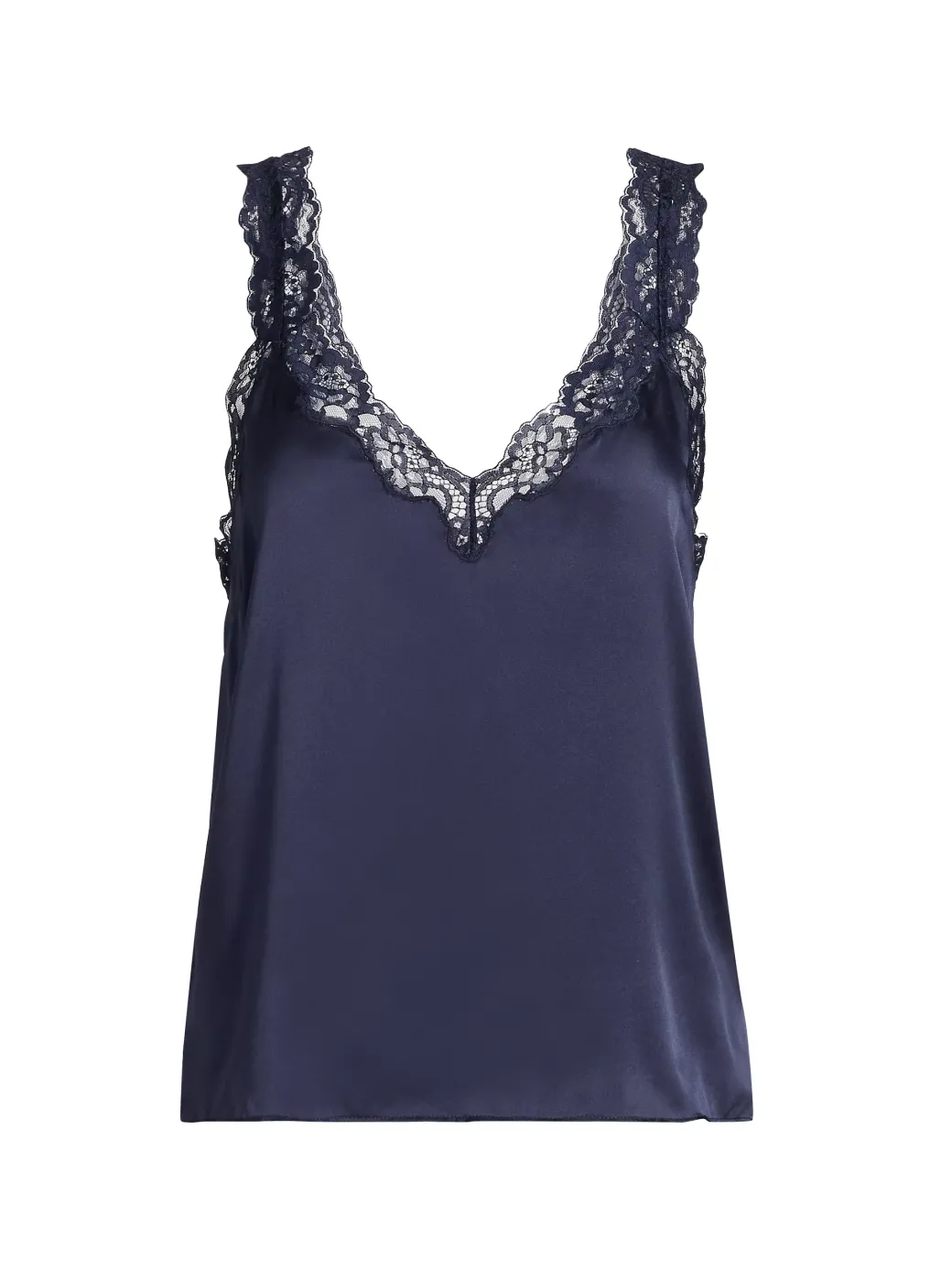 V-neckline, featuring sheer embroidery edge lace, which continues up the straps