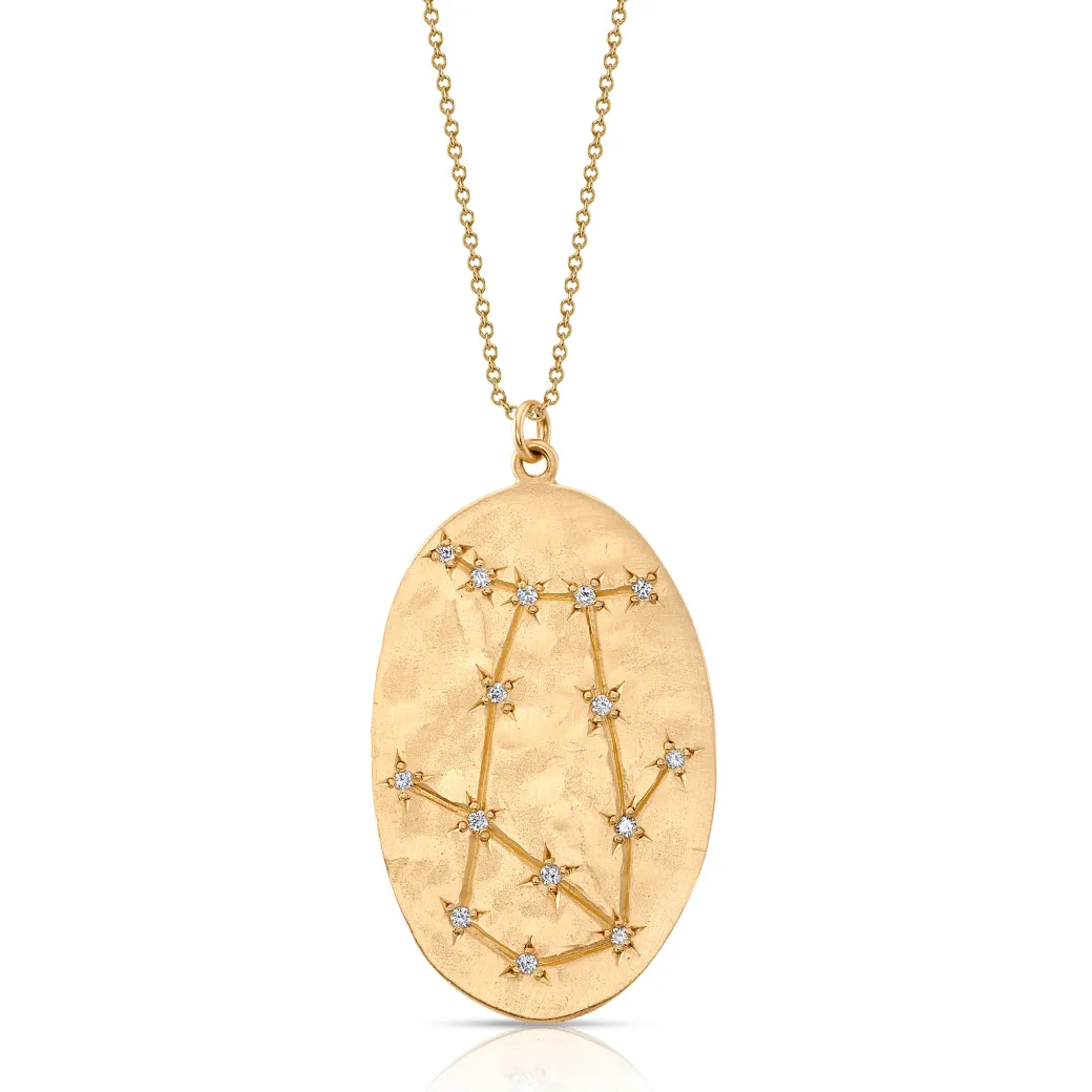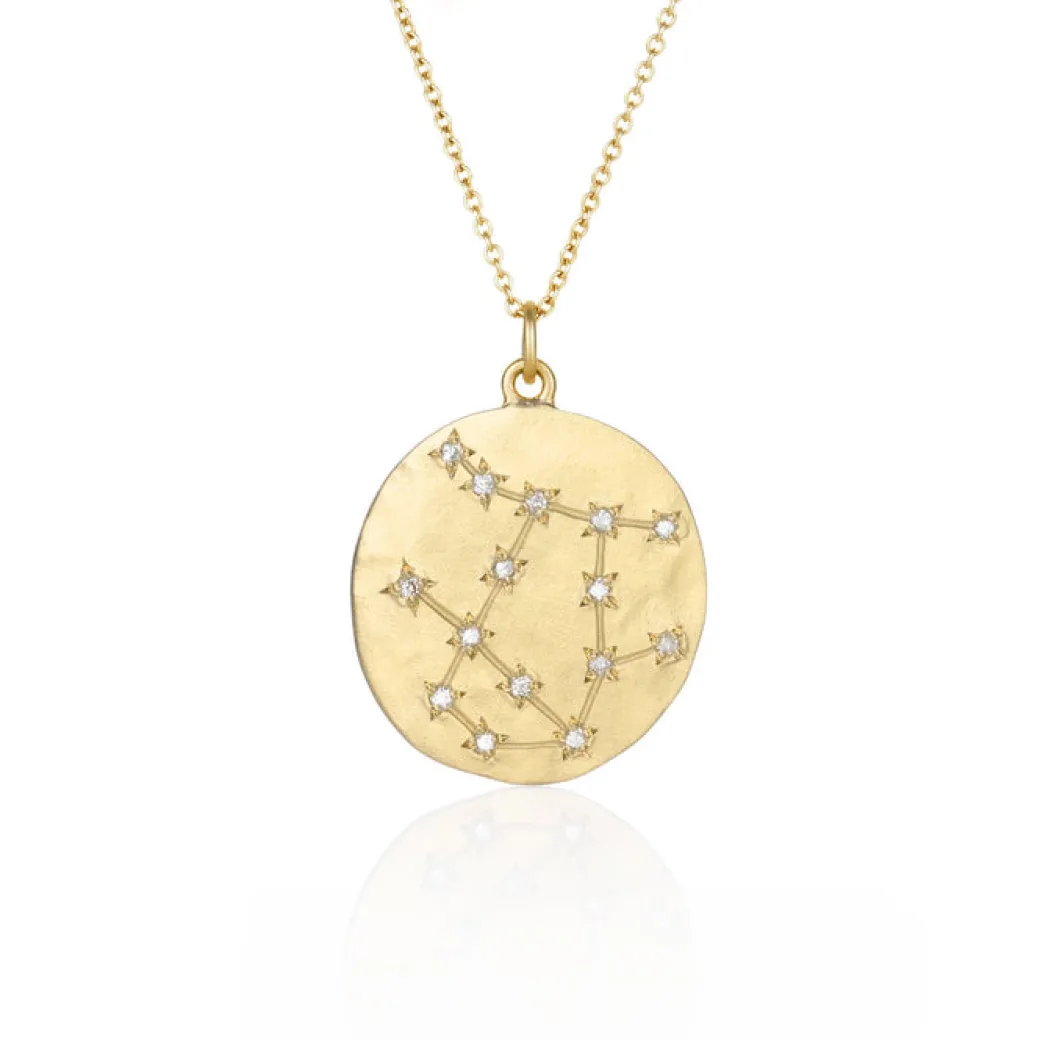 14k brushed gold Astrology necklace with 14 VS1 full cut diamonds in a constellation design with 14k gold chain.