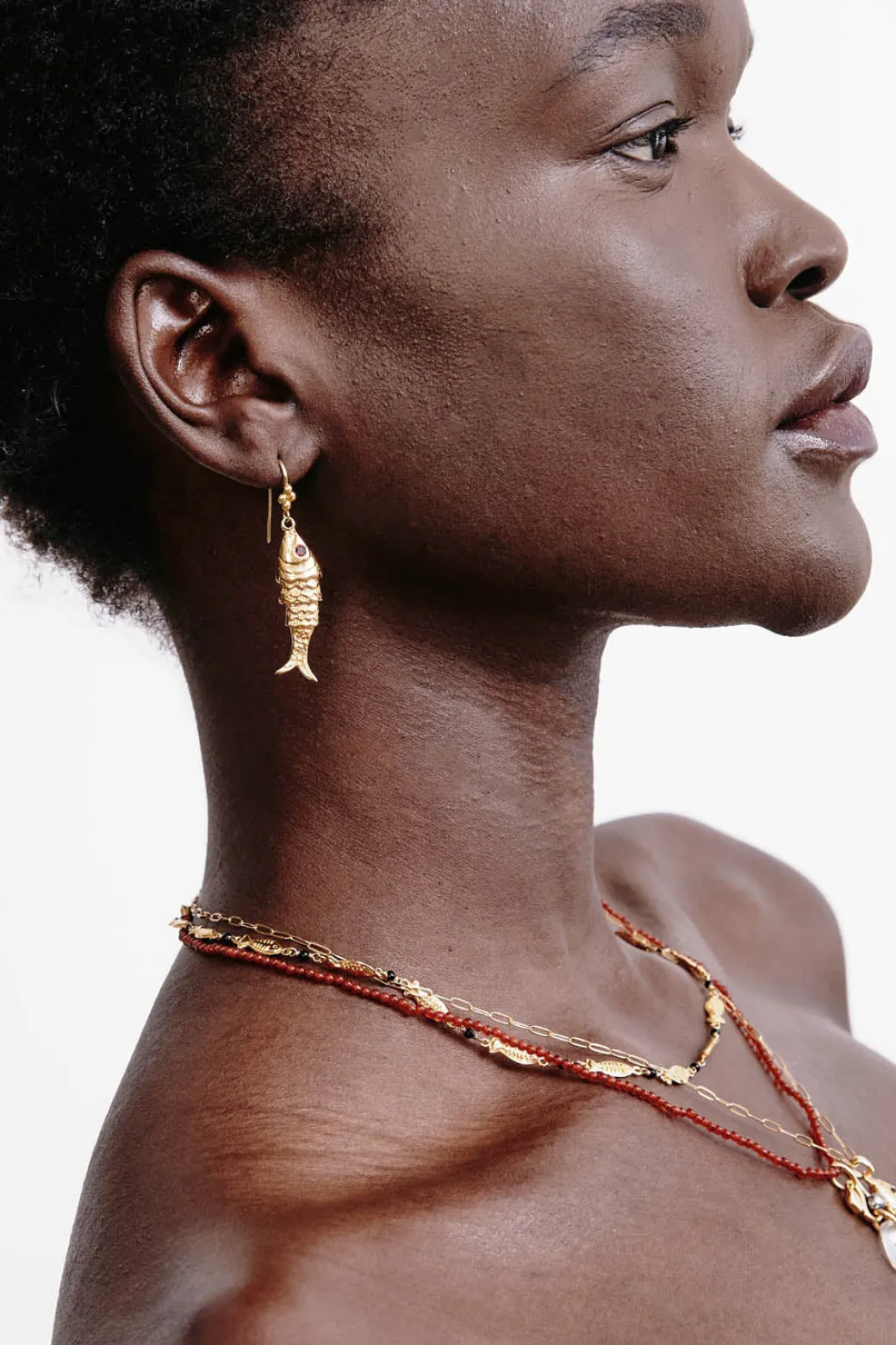 Adorned with captivating red garnet eyes, these gold-plated fish charms dance with every movement on French hooks.