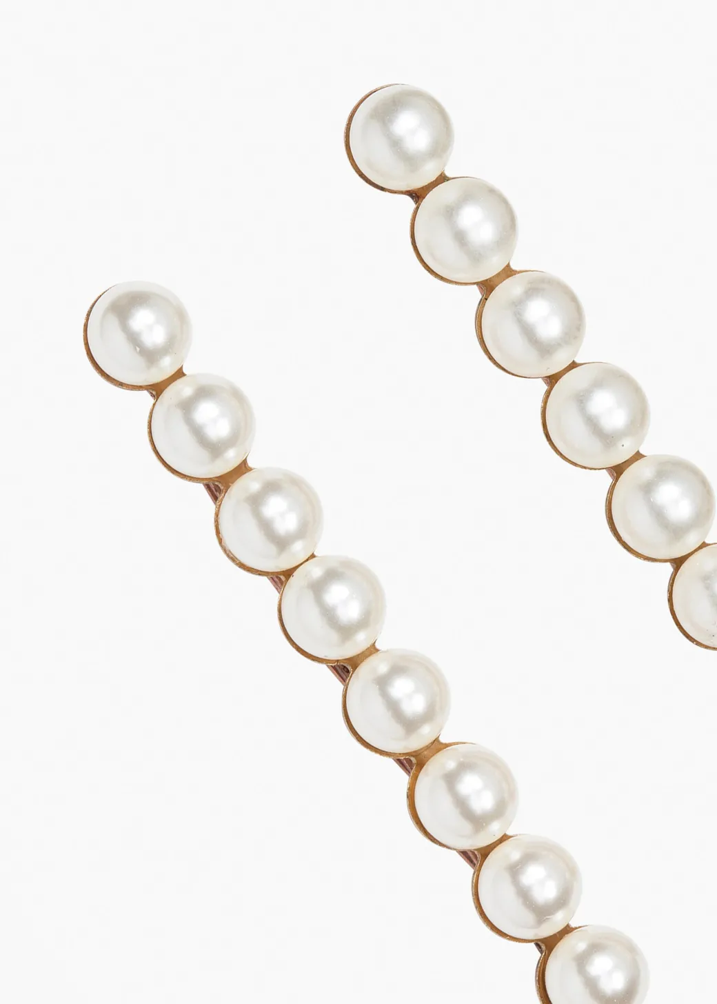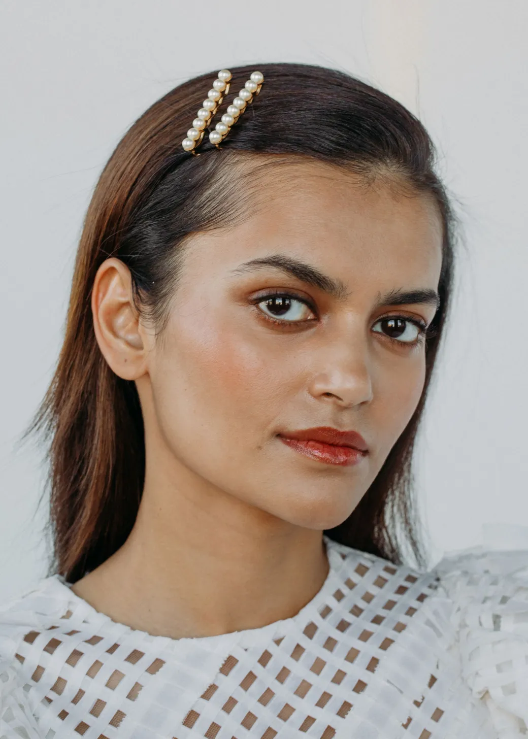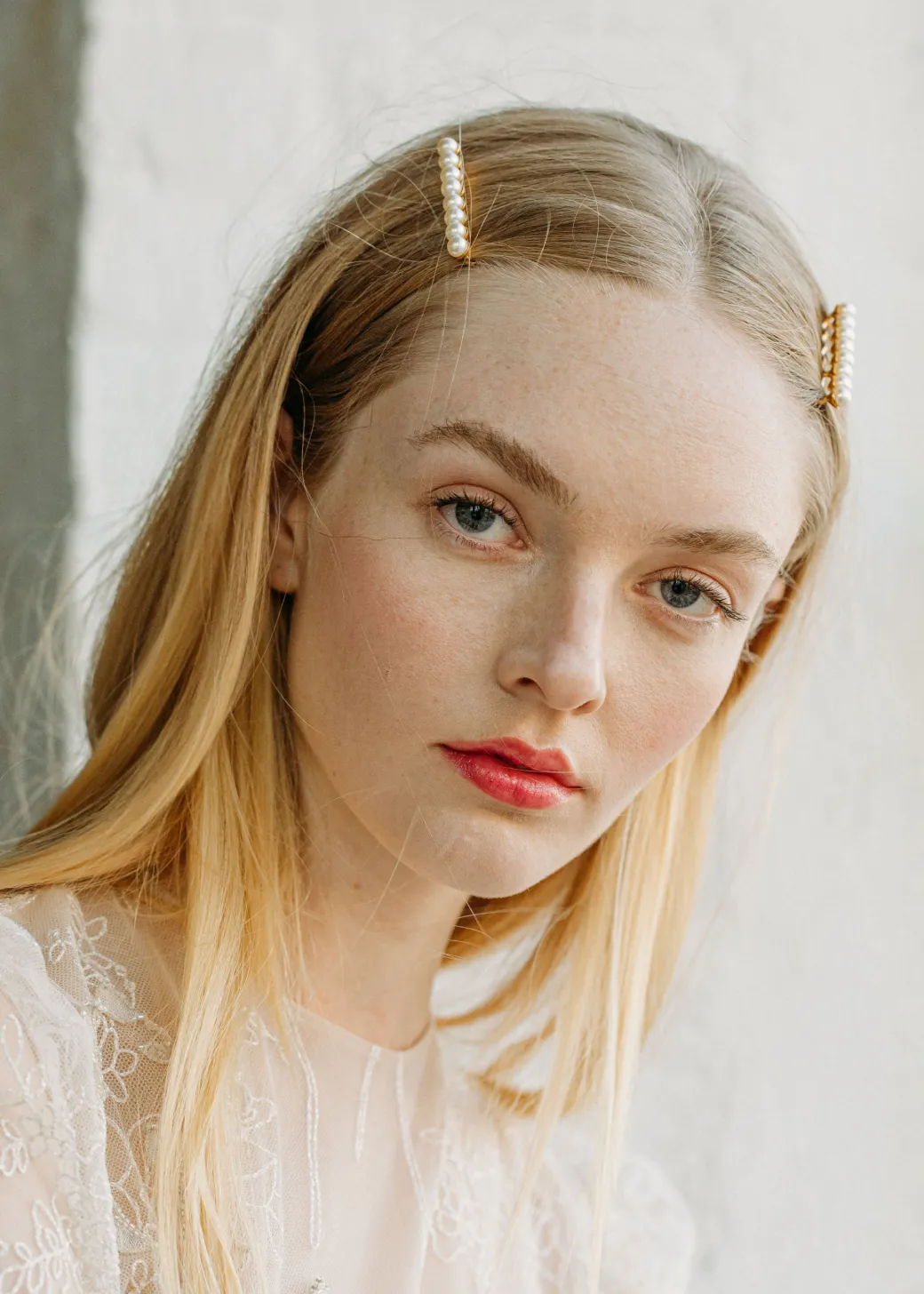 Gracie Bobby Pins are a wardrobe staple. This set of two features rows of hand bezel-set Swarovski pearls, for a sweet yet sophisticated finishing touch. When it comes to bobby pins, more is more: don’t be afraid to layer on multiple sets, or mix with the Gwen Bobby Pins and Perla Bobby Pins.