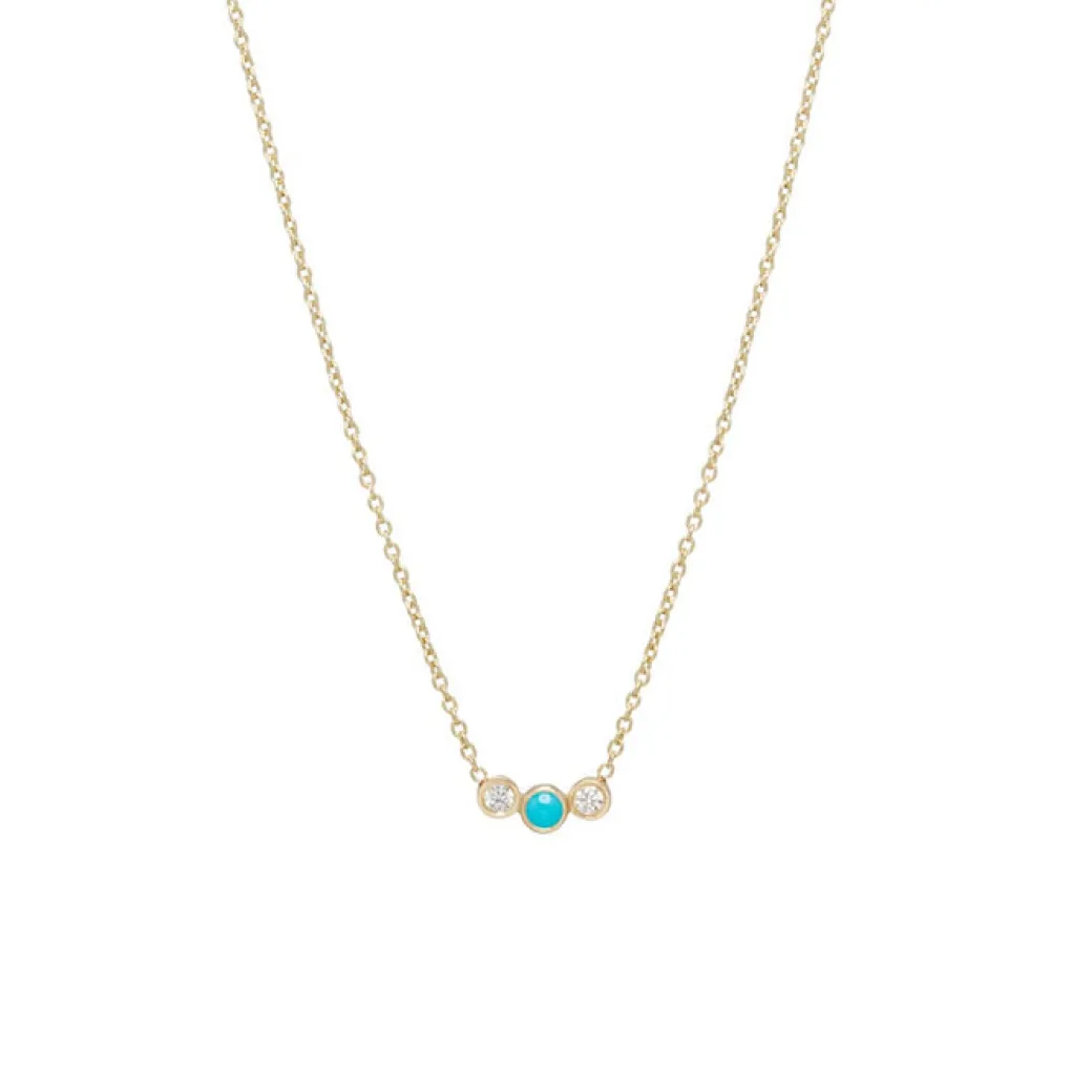 14k gold graduated white diamond necklace with a turquoise stone in the middle