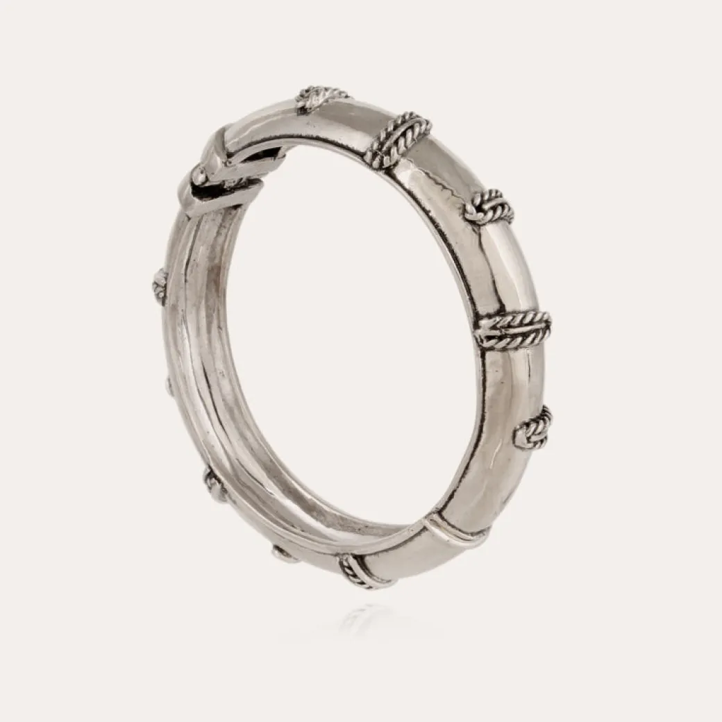 Silver plated bangle bracelet finely adorned with relief ornaments.