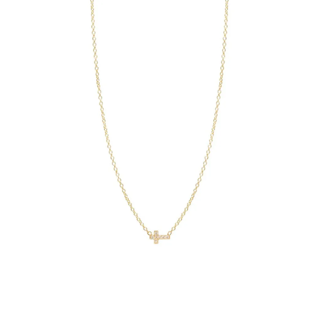 14k gold itty bitty sideways cross covered in white pavé diamonds on a chain necklace