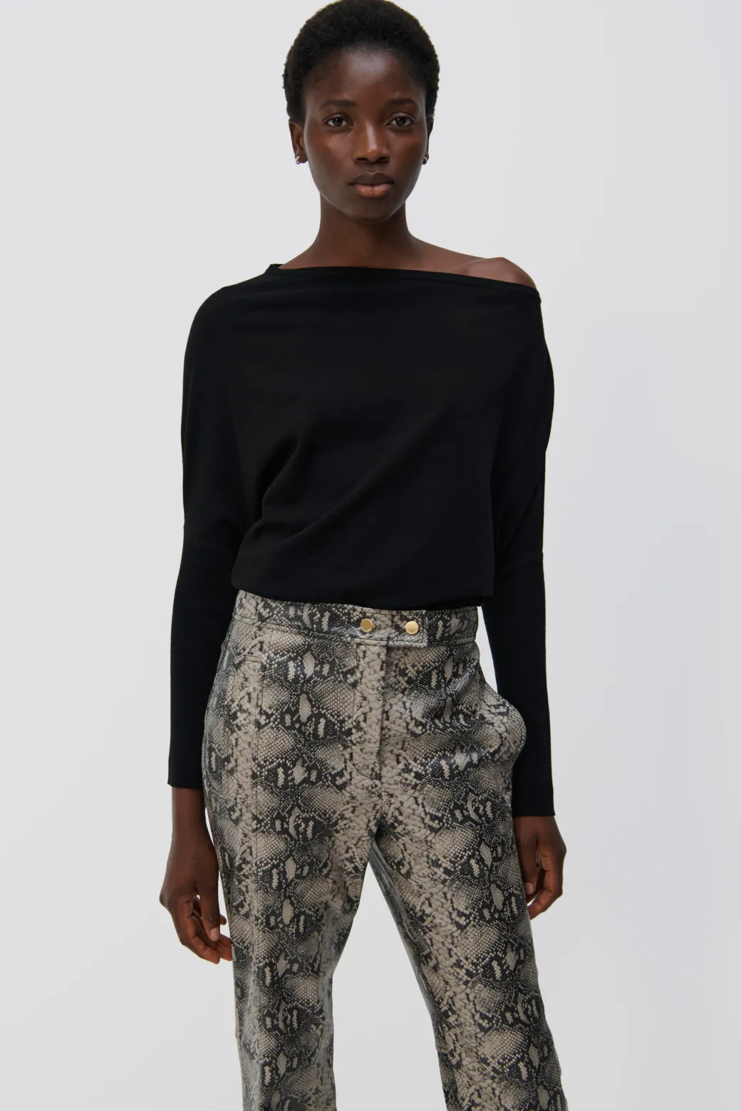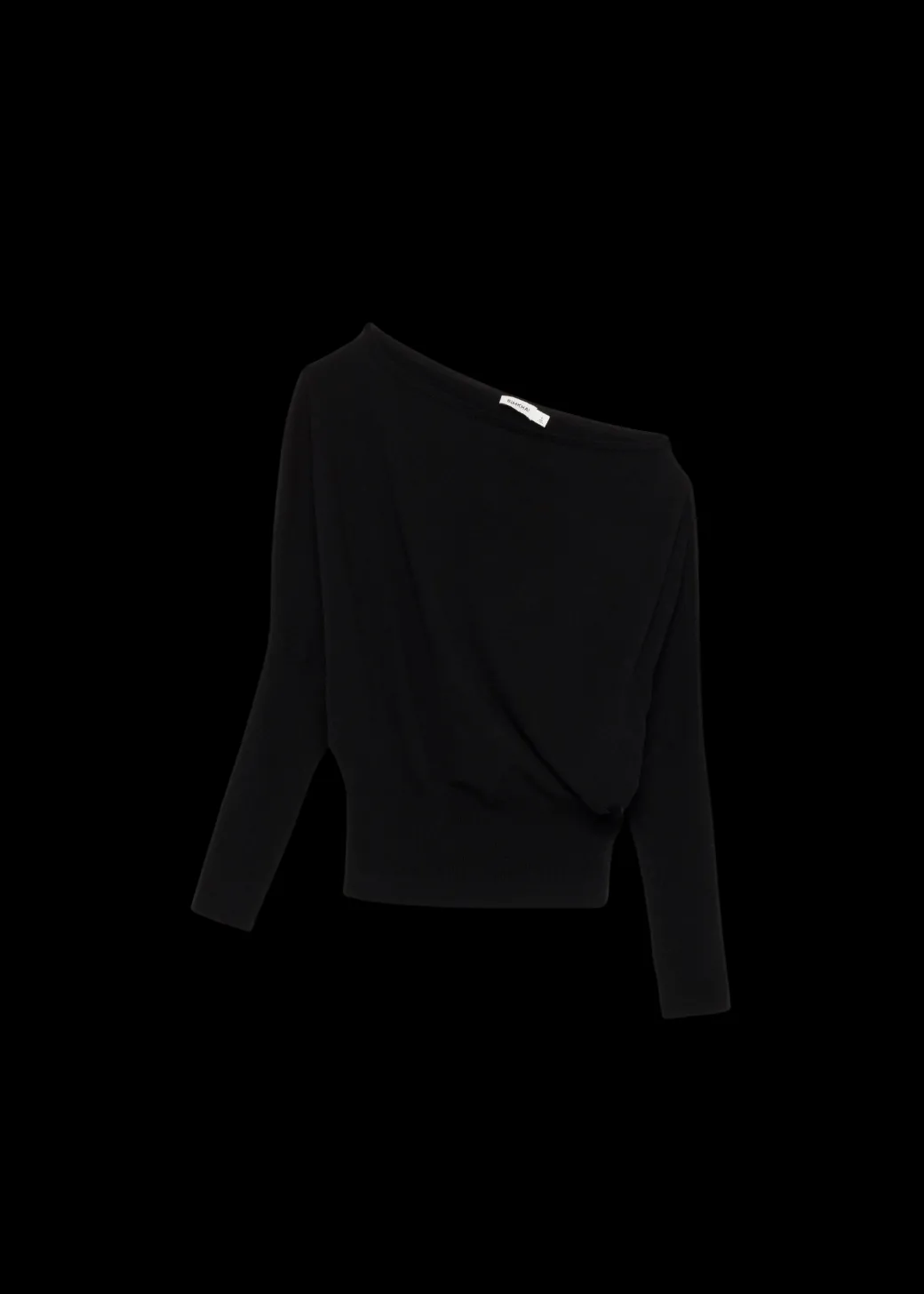 The Lavina Sweater in Black. Highlighting an asymmetric neckline, a lightweight knit pullover with an elegantly draped cold shoulder design.