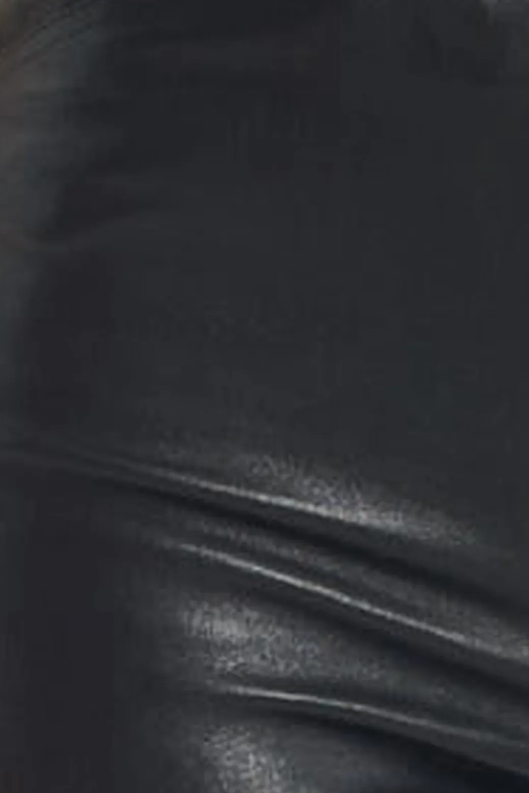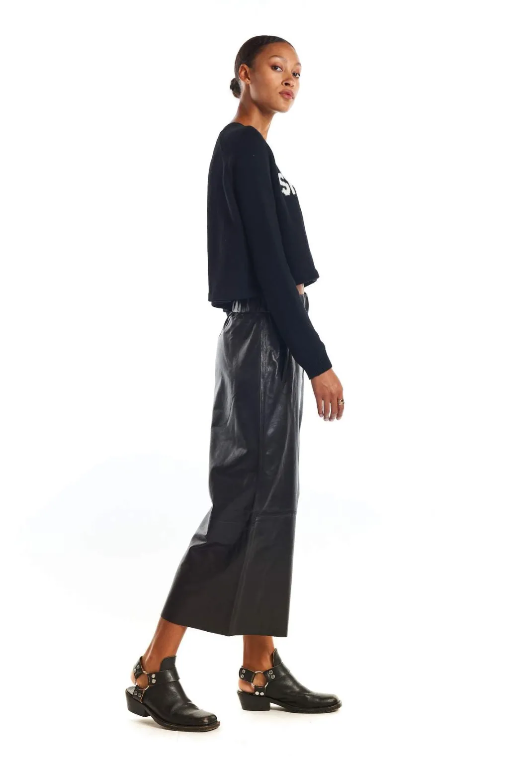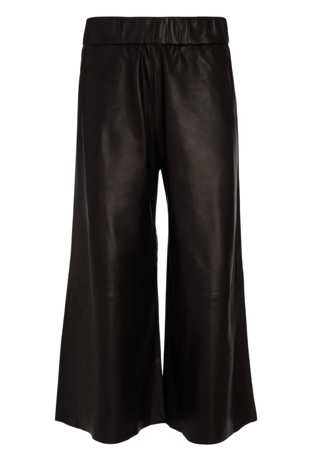 Black leather Culotte Pants with Stretch Leather. Featuring pockets.