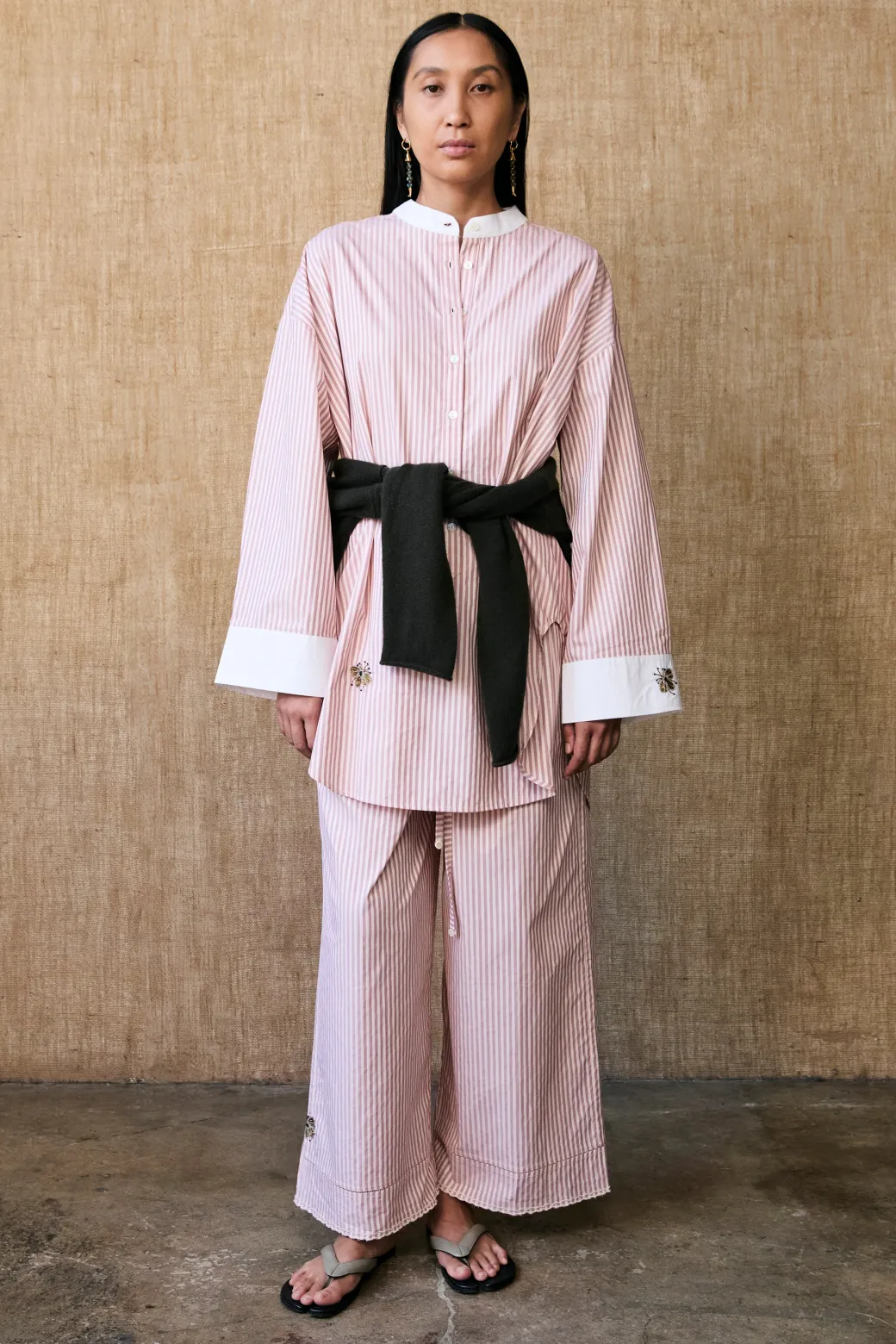 Cotton striped button down blouse with exaggerated sleeves, contrast collar and cuffs, and beaded bee embroidery.