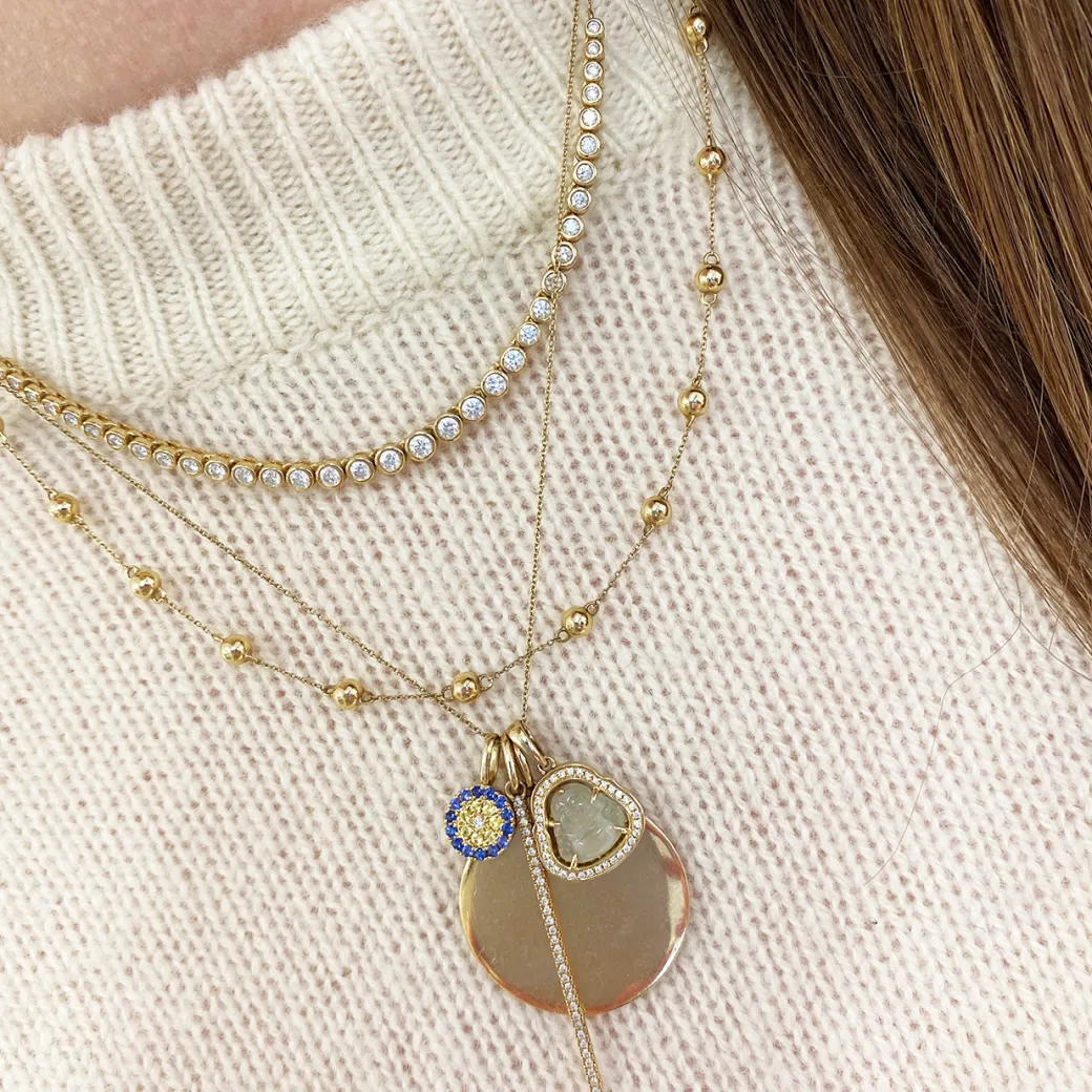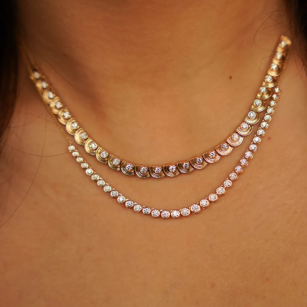 If you didn’t know already, team DRD has a mild obsession with diamond tennis necklaces. The Lulu Jack Graduating Bezel Tennis Necklace, with nearly a full carat of full-cut round brilliant diamonds, is no exception. Needless to say, it packs a diamond necklace punch. Each sparkling white round diamond is bezel-set in 14k gold. Modern yet classic, this diamond layering necklace is highly versatile. The bezel setting is a signature of the Lulu Jack collection. The bezel is sleek, modern, and keeps each diamond secure. The graduating sizes of the diamonds are elegant and flattering – naturally drawing the eye to follow the curve of the necklace.