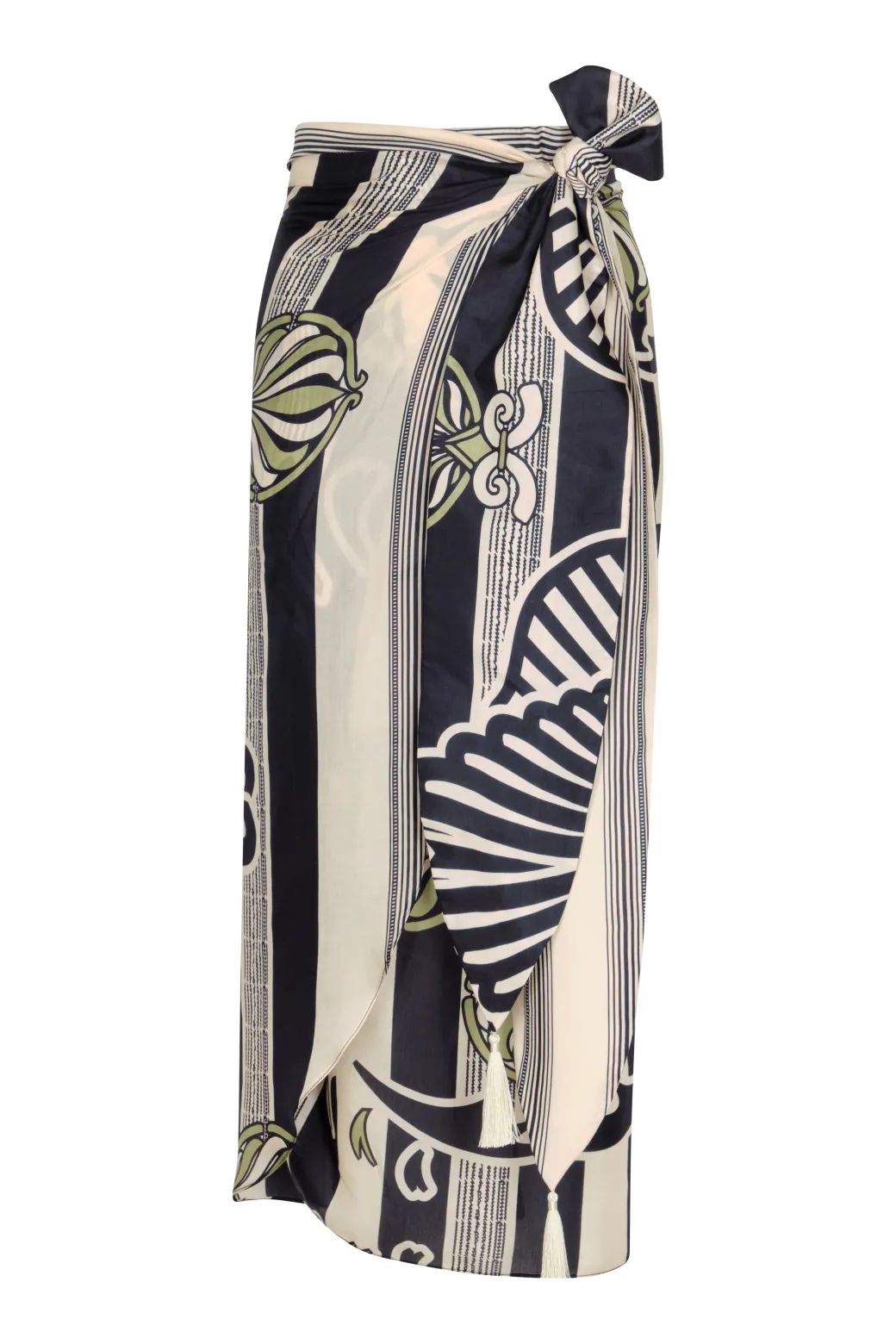 Mapara Cotton Silk Skirt is a wrap-around, light-weight and chic style, featuring this season’s beautiful Navy Ornaments Stripes print. Inspired in summer nights at Saint-Tropez, this style is the epitome of sophistication and style.