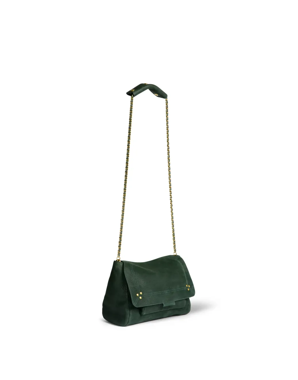 Adjustable chain and leather shoulder strap measuring 105 cm. Wide leg shoulder belt. Flap with snap button closure. One small pocket under the flap. One exterior zipped pocket. One interior pocket. One key hook inside.