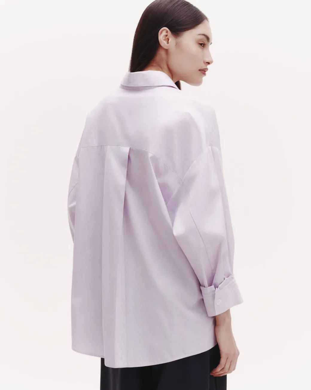 Oversized button down shirt in striped Italian cotton shirting. The Earl is a relaxed shirt featuring an asymmetric button front. Complete with a spread collar, chest patch pocket, back yoke, box pleat at the back, and single roll button cuffs.