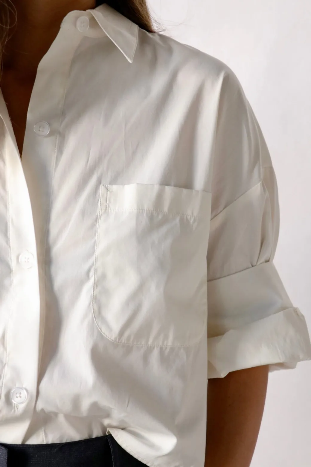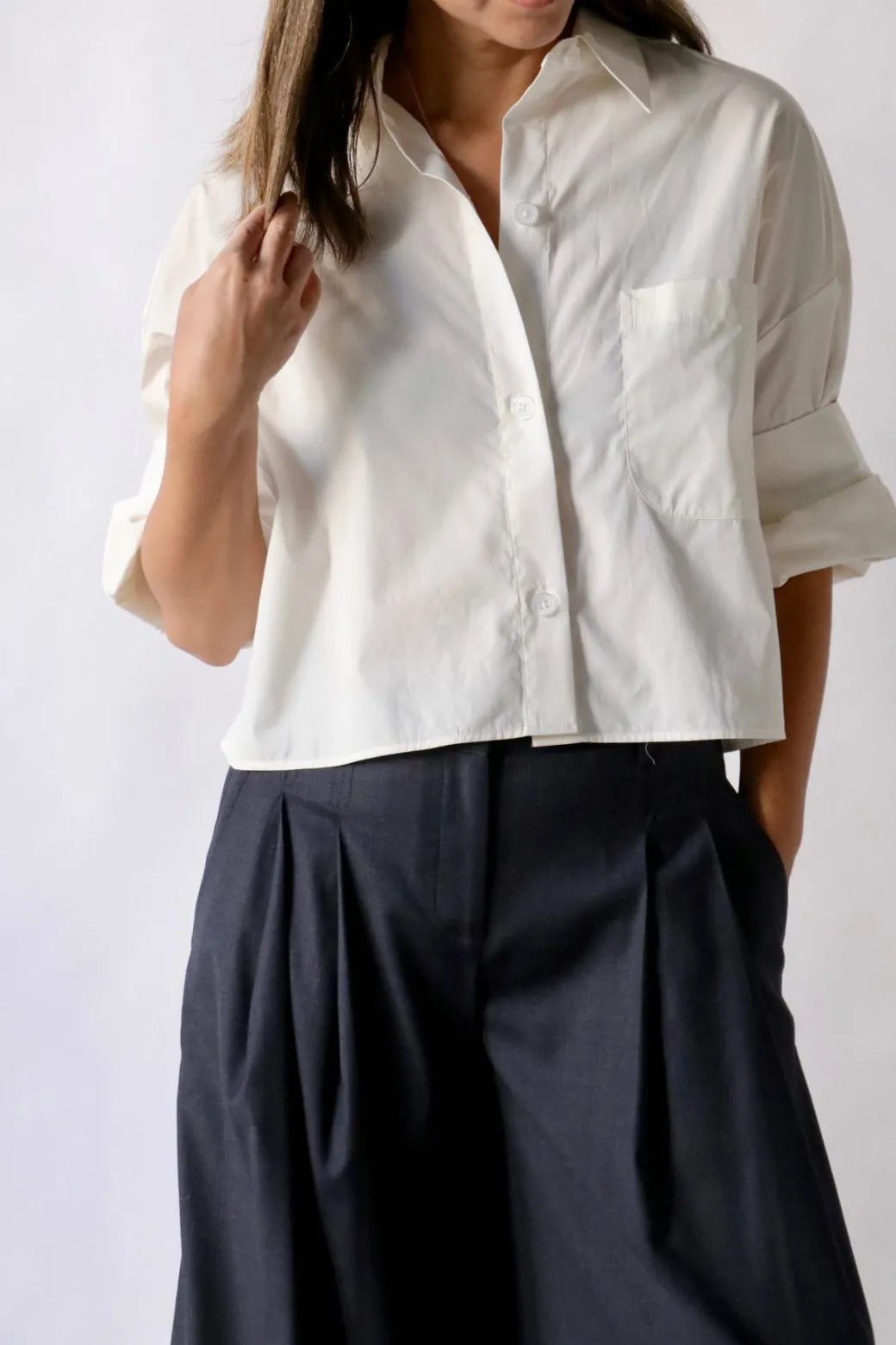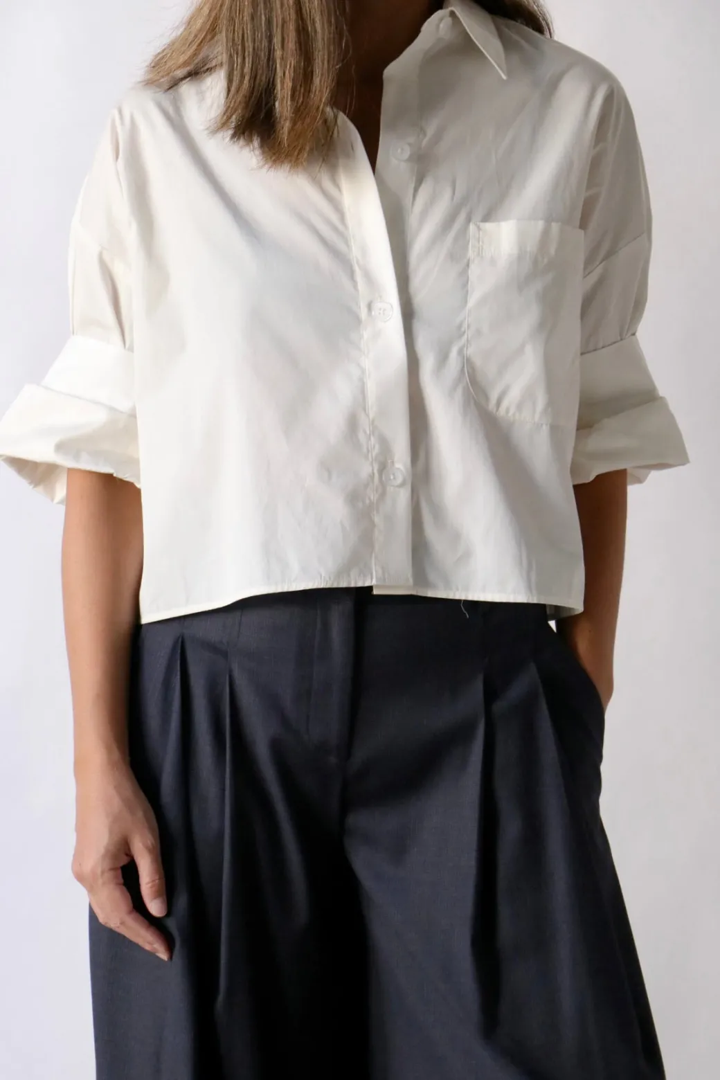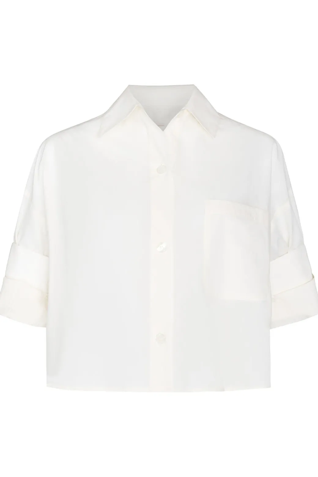 Upgrade your wardrobe with TWP’s Next Ex Top! This short-sleeved button down is expertly crafted from the finest Italian cotton shirting. Boasting a cropped, boxy silhouette, it features a convenient chest patch pocket, button up placket, spread collar, and our signature double roll button cuffs. Trust us, this stylish and comfortable top is a must-have for any fashionista.