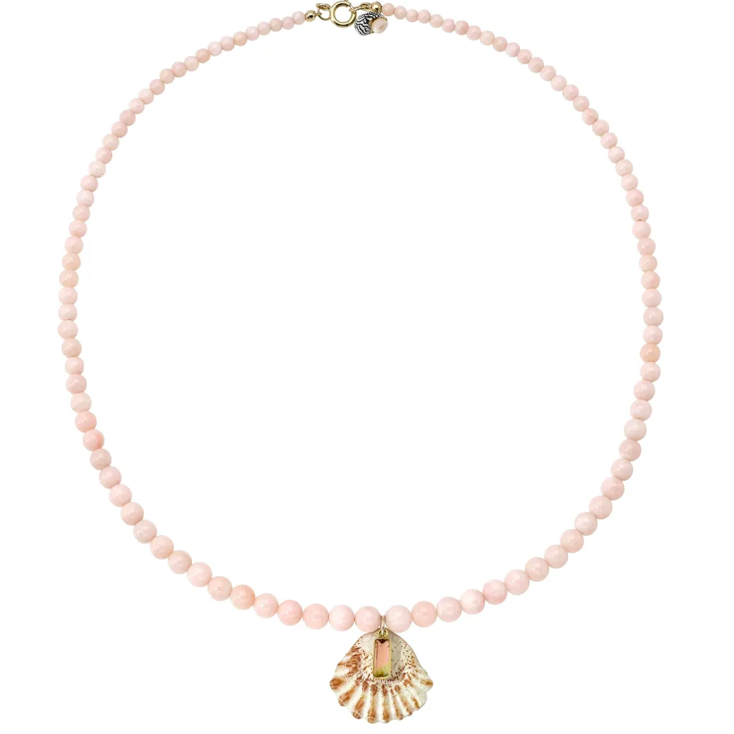 Pink Opal rounds, Lion’s Paw Shell, Pink Tourmaline charm 14k gold Necklace