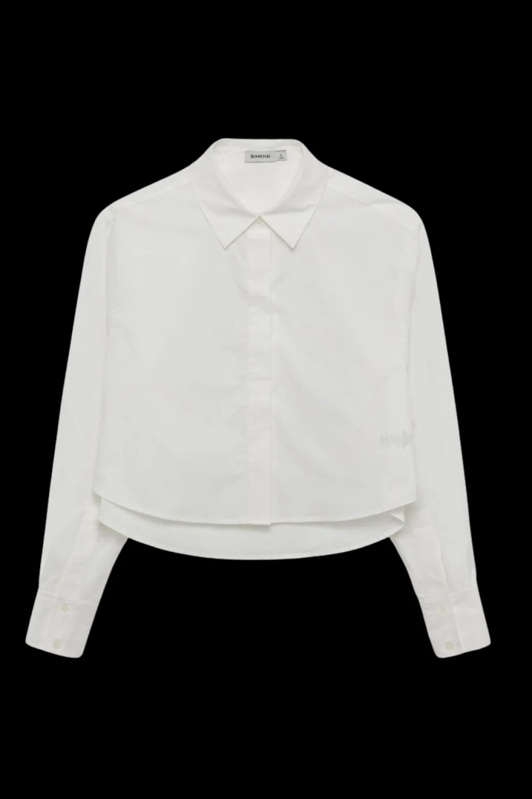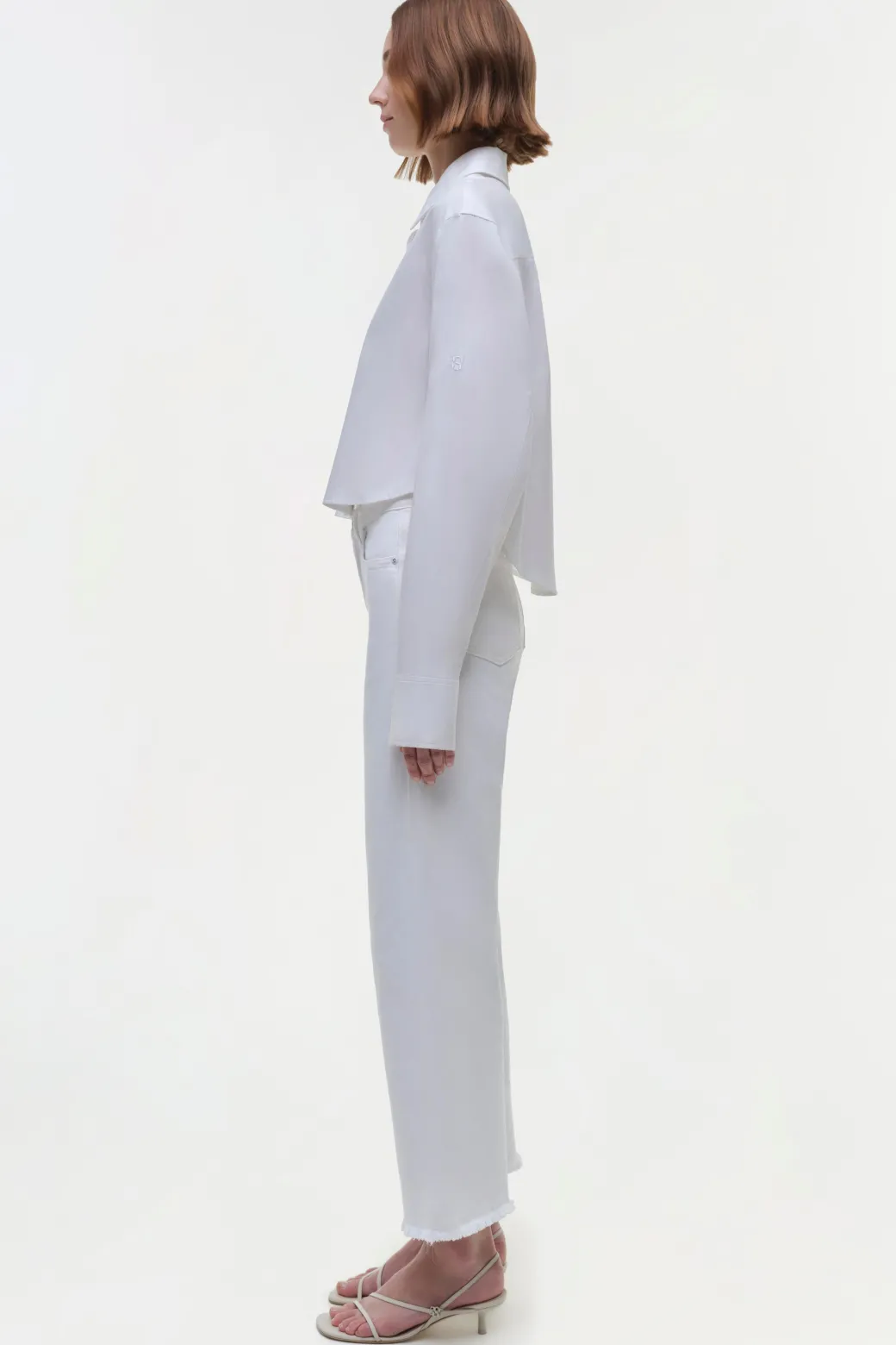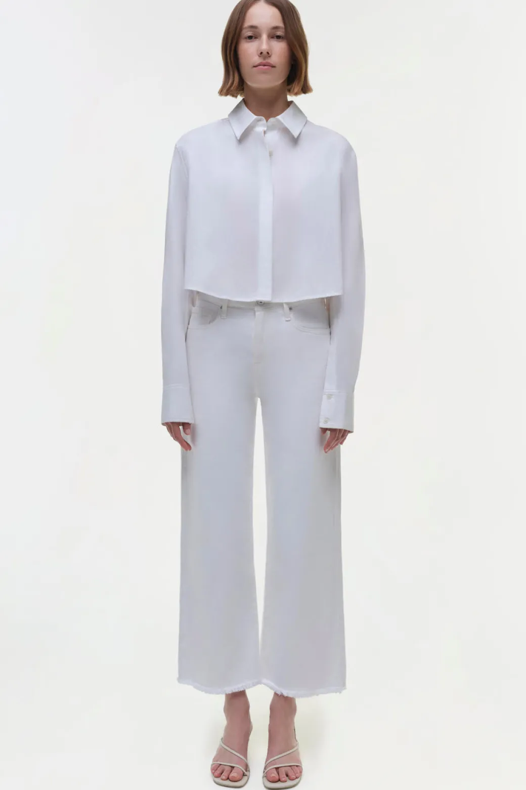The Renata Shirt in White. Elevate your wardrobe with this crisp cropped button-down. Designed with a sharp collar and a clean front, its tailored fit provides a sophisticated silhouette. Perfectly versatile, it’s a modern staple for both casual and dressier ensembles.